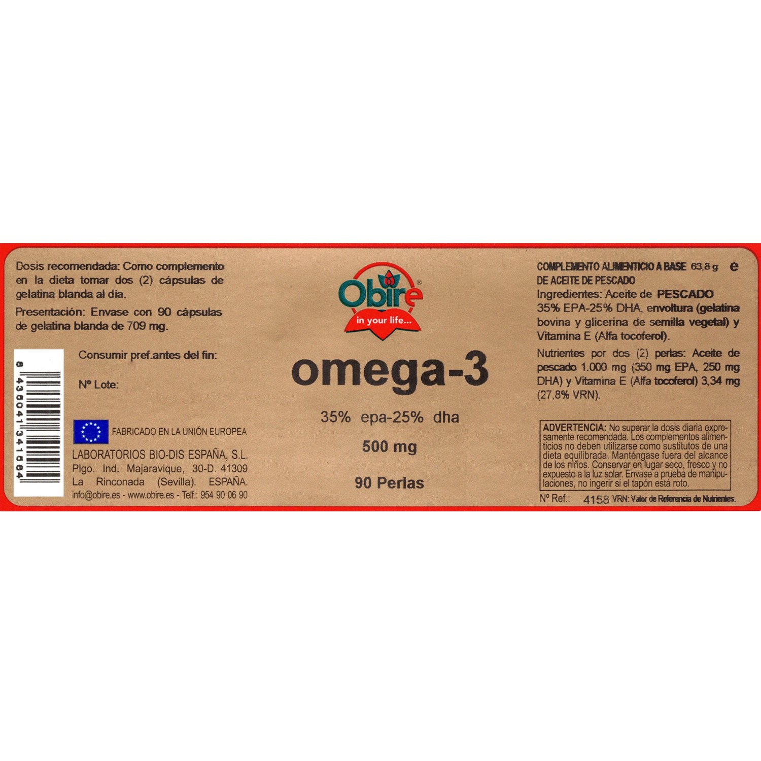 Omega 3 35% Epa 25 % Dha de Obire es un complemento alimenticio que ofrece una fórmula especializada a base de aceite de pescado rico en ácidos grasos saturados, Omega 3 EPA + DHA + Vitamina E. Este producto ha sido diseñado para proporcionar una serie de beneficios para la salud, gracias a sus propiedades y composición única.