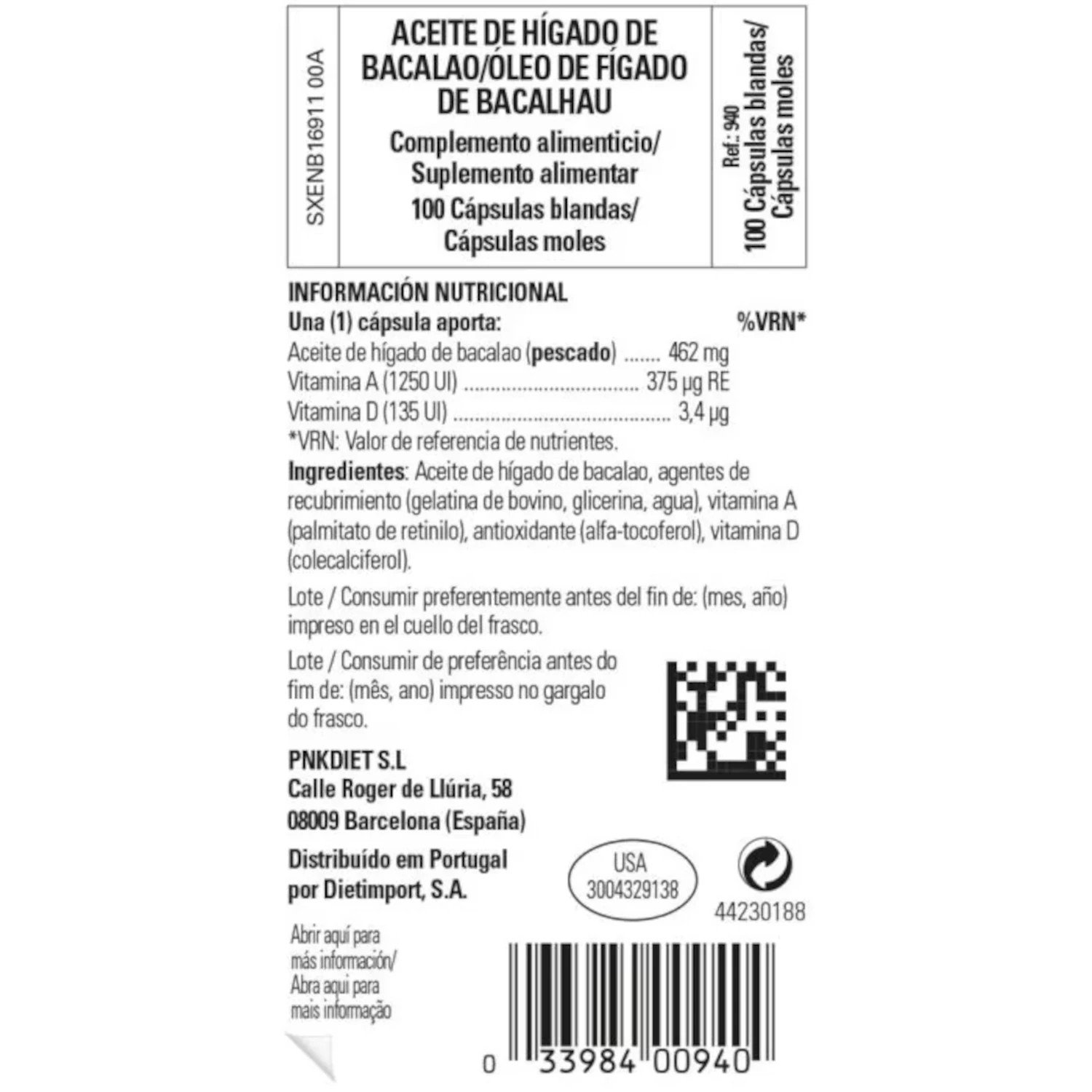 Aceite de hígado de bacalao (pescado), agentes de recubrimiento (gelatina de bovino, glicerina, agua), vitamina A (palmitato de retinilo), antioxidante (alfa-tocoferol), vitamina D (colecalciferol).