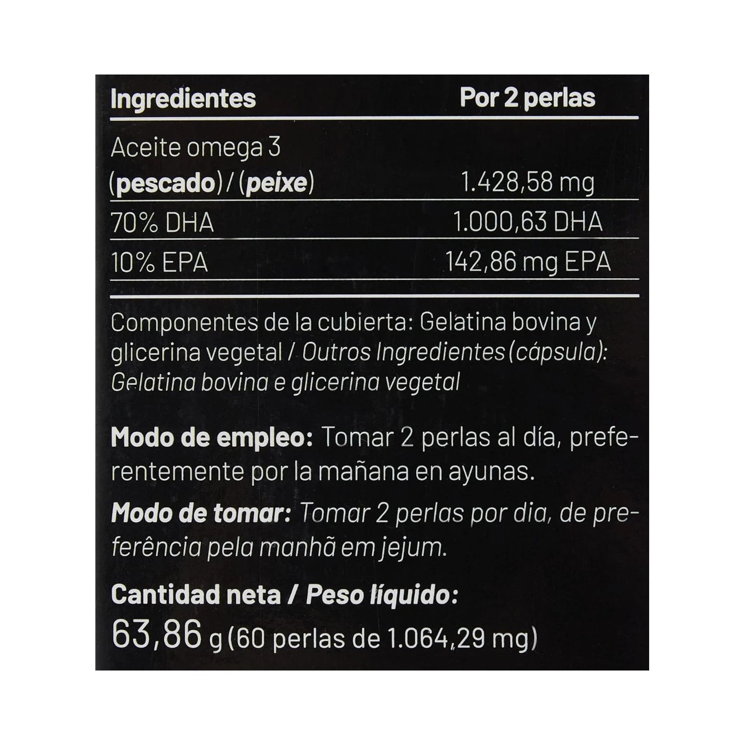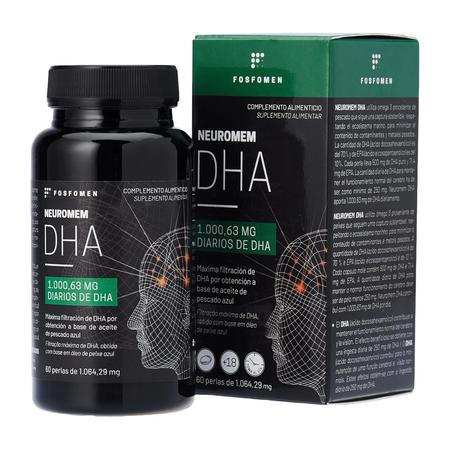 El DHA representa el 70% de los ácidos grasos presentes en el producto, mientras que el EPA (ácido eicosapentaenoico) aporta un 10%. Cada cápsula contiene 500 mg de DHA puro y 71,4 mg de EPA, recomendándose la ingesta de dos cápsulas diarias para maximizar los beneficios cognitivos.