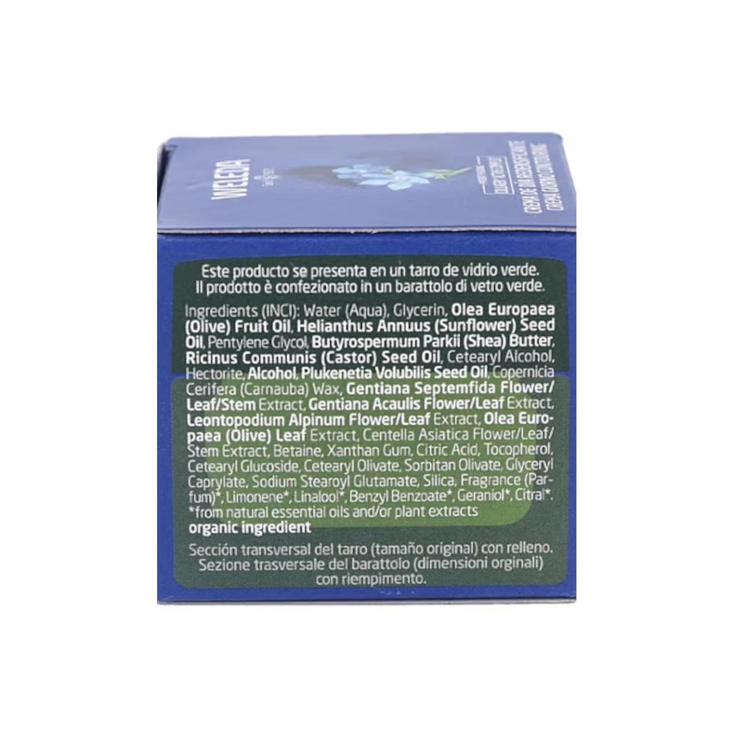 · Contiene extracto orgánico de edelweiss, que refuerza la barrera cutánea y ayuda a ralentizar el proceso de envejecimiento, y extracto orgánico de genciana azul, que estimula la producción de colágeno y reafirma la piel