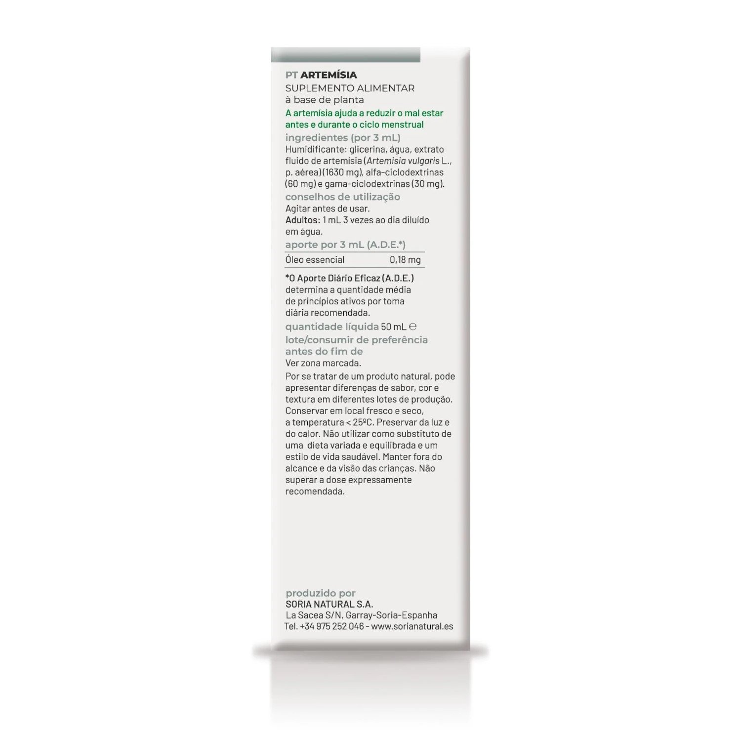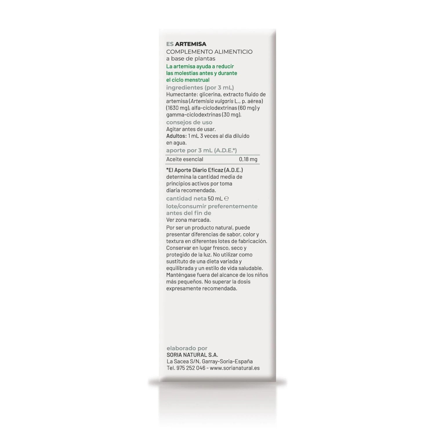 El Extracto de Artemisa de Soria Natural es un complemento nutricional formulado específicamente para apoyar la salud femenina y mejorar problemas digestivos. Este producto destaca por su contenido en aceite esencial de artemisa, conocido por sus propiedades reguladoras del ciclo menstrual y por su capacidad para aliviar molestias asociadas, como los dolores menstruales.