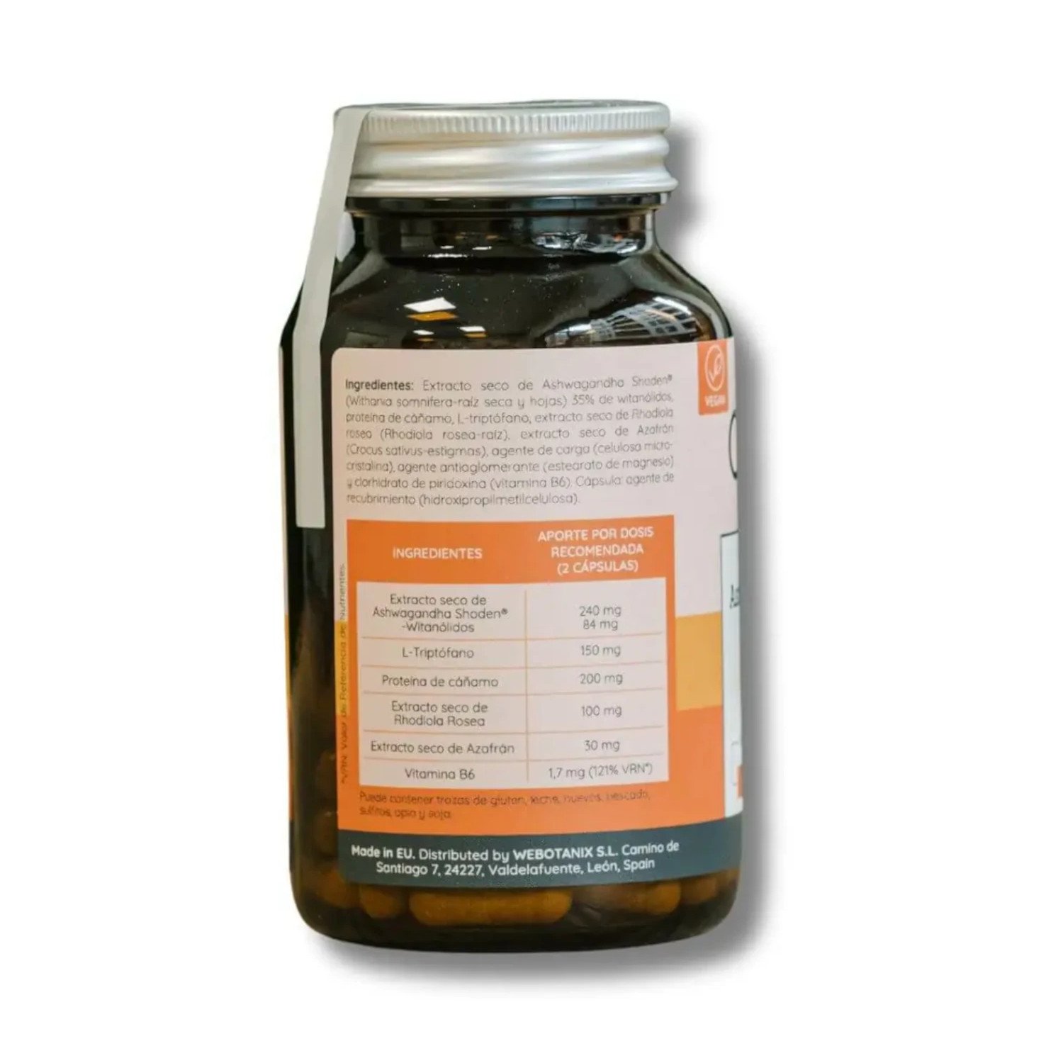 Extracto seco de Ashwagandha Shoden® (Withania somnífera-raíz seca y hojas) 35% de witanólidos, proteína de cáñamo, L-triptófano, extracto seco de Rhodiola rosea (Rhodiola rosea-raíz), extracto seco de Azafrán (Crocus sativus-estigmas), agente de carga (celulosa microcristalina), agente antiaglomerante (estearato de magnesio) y clorhidrato de piridoxina (vitamina B6). Cápsula: agente de recubrimiento (hidroxipropilmetilcelulosa).
