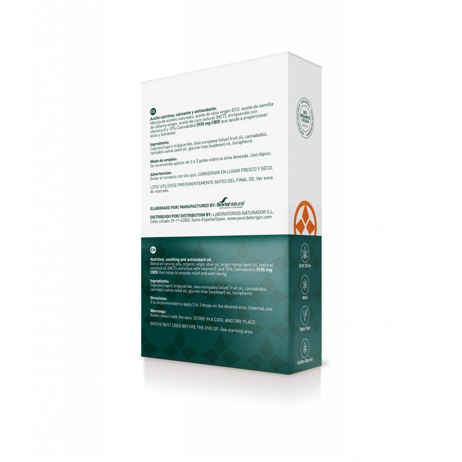 Mezcla de aceites naturales, aceite de oliva virgen ECO, aceite de semilla de cáñamo virgen, aceite de coco natural (MCT), enriquecido con vitamina E y 10% Cannabidiol (935 mg CBD).