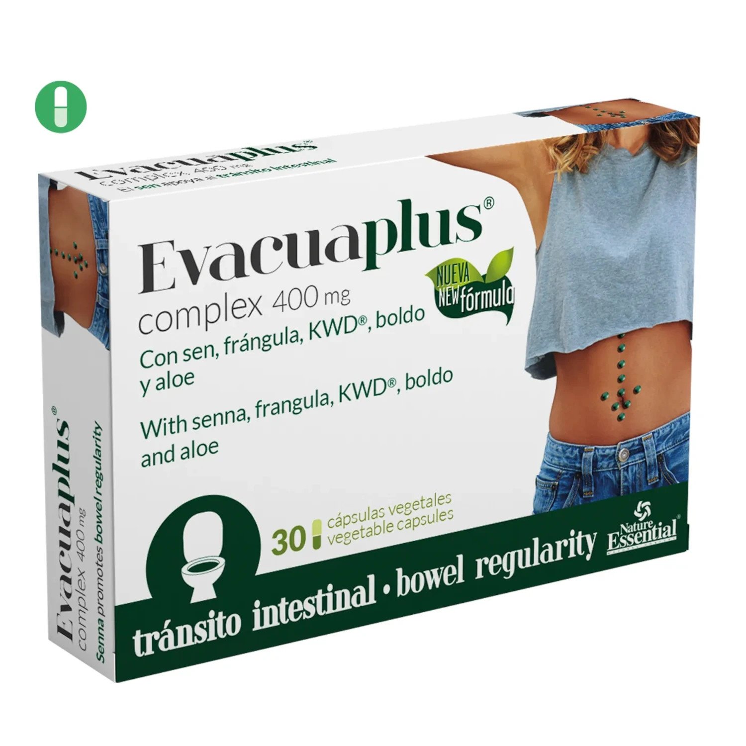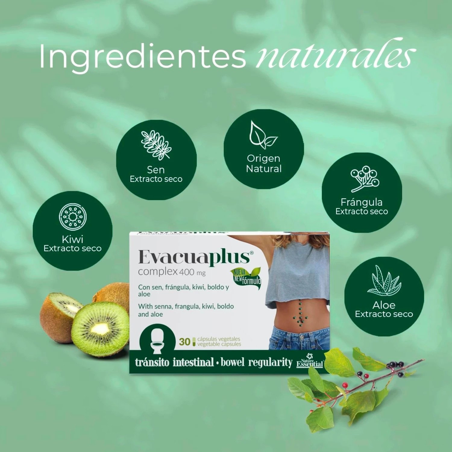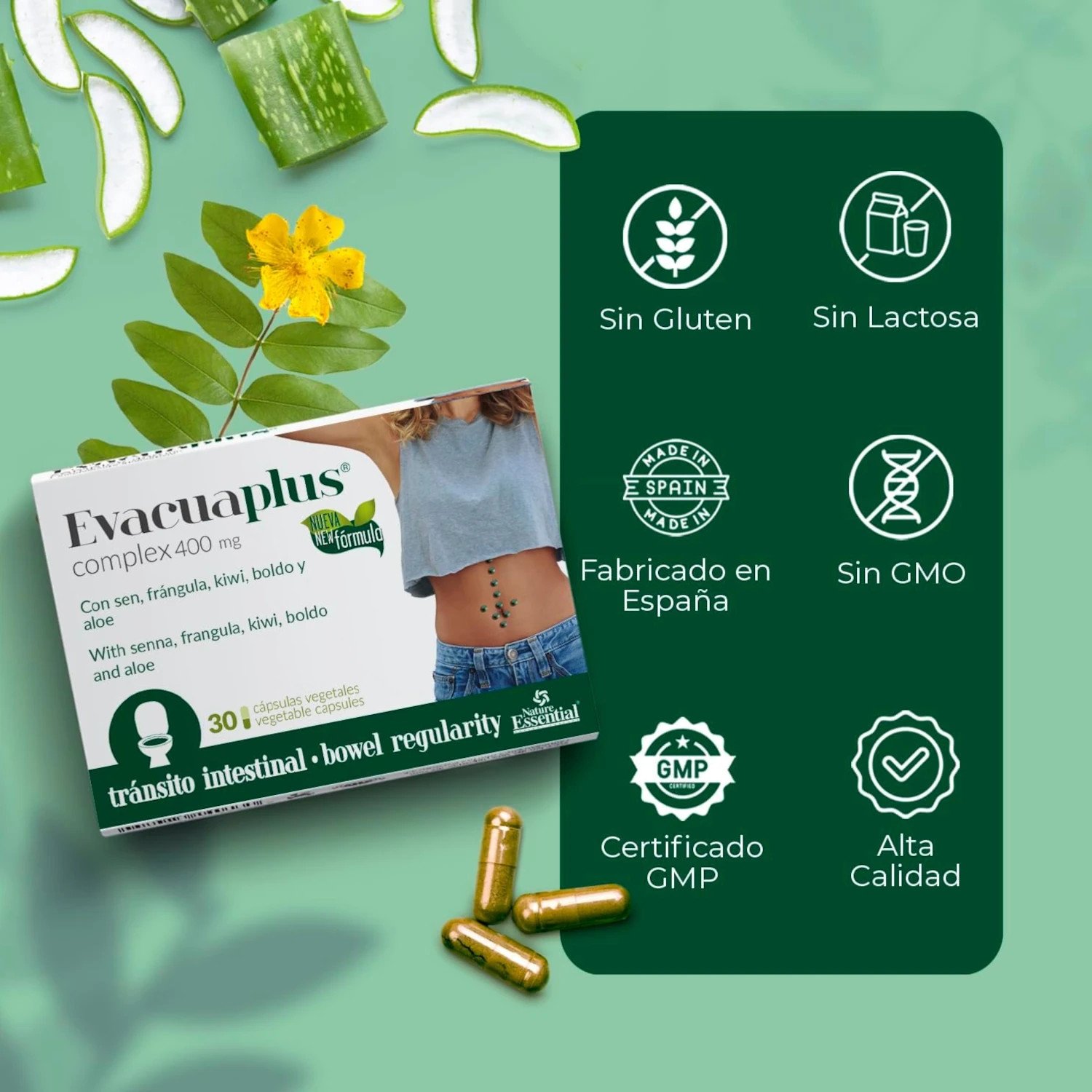 Evacuaplus Complex de Nature Essential es un suplemento alimenticio diseñado para favorecer el tránsito intestinal de manera natural y eficaz. Su fórmula combina extractos de plantas medicinales como Aloe y Sen, junto con carbón vegetal activado, ingredientes reconocidos por sus propiedades beneficiosas para la salud digestiva.