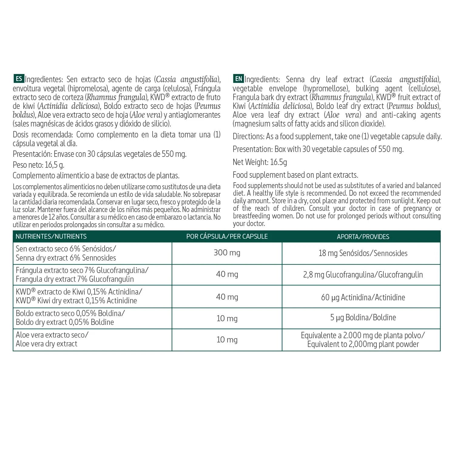 Formulado con Sen, Frángula, Kiwi, Boldo y Aloe vera que tienen propiedades que ayudan a combatir el estreñimiento, produciendo mayor motilidad intestinal.