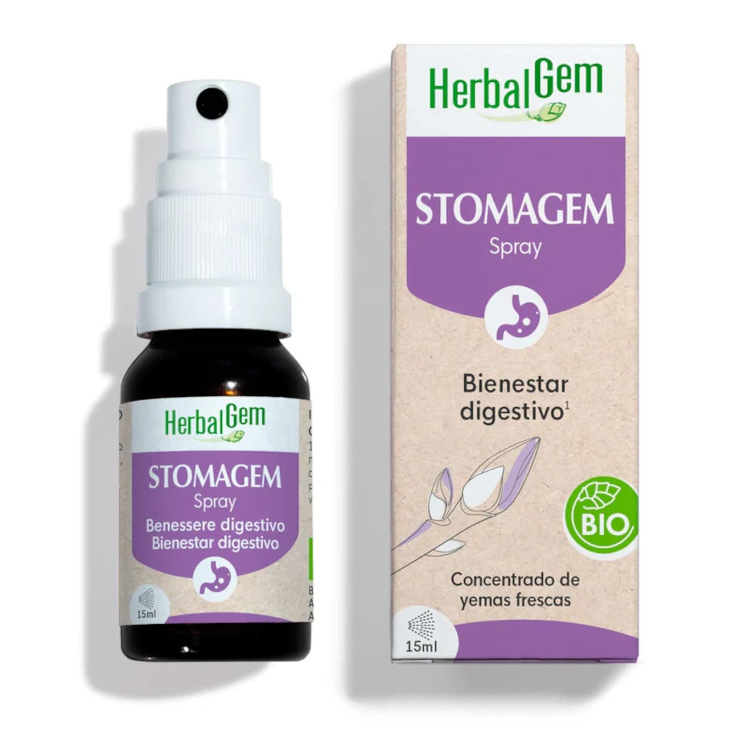 Stomagem Bio de Herbalgem es un complemento natural diseñado para apoyar el bienestar digestivo. Su formulación combina ingredientes específicos como la corteza de los tallos tiernos de limón y los cogollos de saúco, que contribuyen a un vaciado gástrico más eficiente. Además, los brotes tiernos de romero ayudan a mantener la salud de la mucosa intestinal, mientras que los cogollos de higuera, con su efecto calmante, colaboran en el manejo de la ansiedad y los miedos.