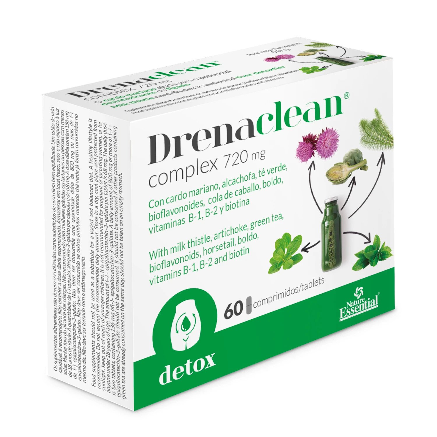 Drenaclean Complex de Nature Essential es un complemento alimenticio diseñado para apoyar la salud hepática y promover la depuración del organismo. Su fórmula combina extractos de plantas naturales como la alcachofa, el té verde, la cola de caballo y el boldo, ingredientes reconocidos por sus propiedades beneficiosas. Además, incluye bioflavonoides, vitaminas y cardo mariano, un componente clave por su capacidad para potenciar las funciones detoxificantes del hígado.