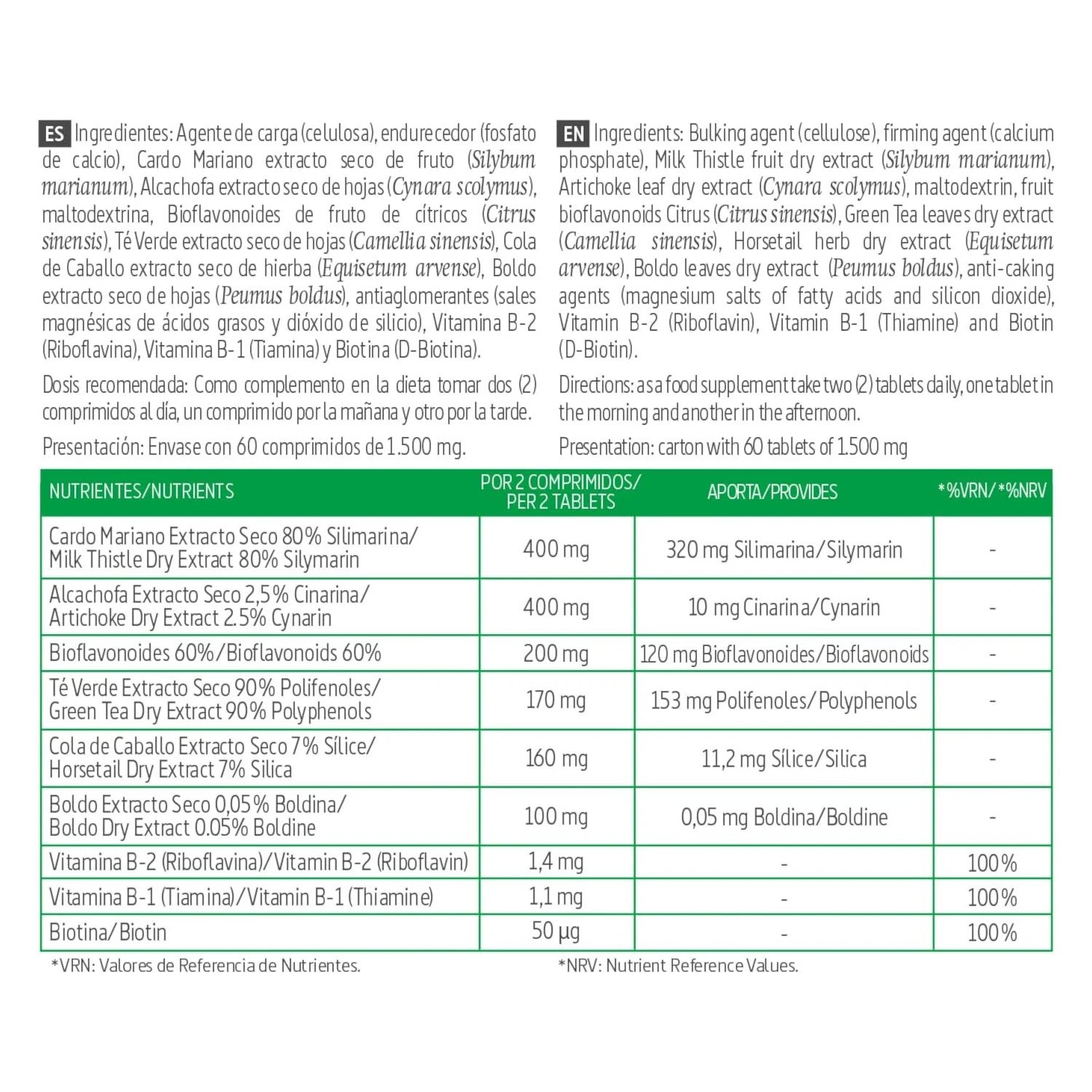 Agente de carga (celulosa), Endurecedor (fosfato de calcio), Extracto seco de fruto de Cardo Mariano (Silybum marianum), Extracto seco de hojas de Alcachofa (Cynara scolymus), Maltodextrina, Bioflavonoides de fruto de cítricos (Citrus sinensis), Extracto seco de hojas de Té Verde (Camellia sinensis), Extracto seco de hierba de Cola de Caballo (Equisetum arvense), Extracto seco de hojas de Boldo (Peumus boldus), Antiaglomerantes (sales magnésicas de ácidos grasos y dióxido de silicio), Vitamina B2 (Riboflavina), Vitamina B1 (Tiamina) y Biotina (D-Biotina).