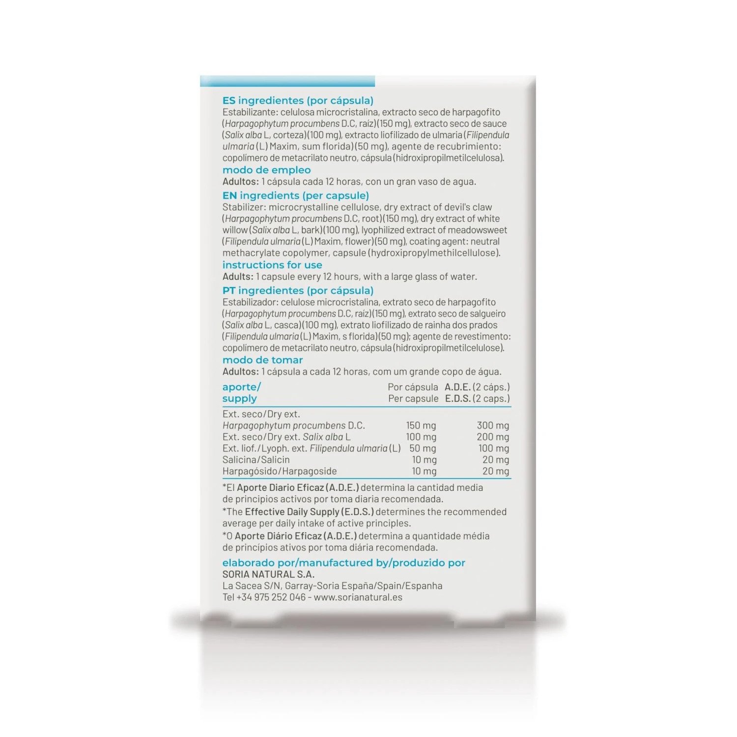Estabilizante: celulosa microcristalina, extracto seco de harpagofito (Harpagophytum procumbens D.C, raíz) (150 mg), extracto seco de sauce (Salix alba L, corteza) (100 mg), extracto liofilizado de ulmaria (Filipendula ulmaria (L) (Maxim, sum. florida) (50 mg), agente de recubrimieno: copolímero de metacrilato neutro, cápsula (hidroxipropilmetilcelulosa).