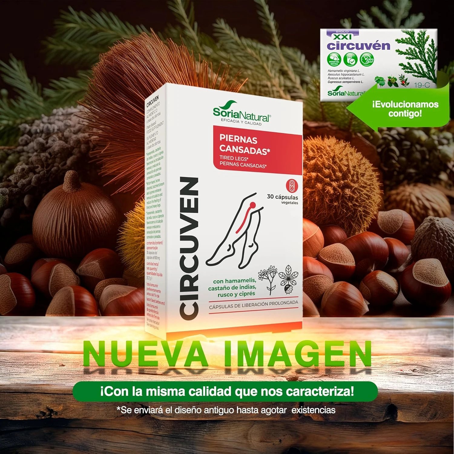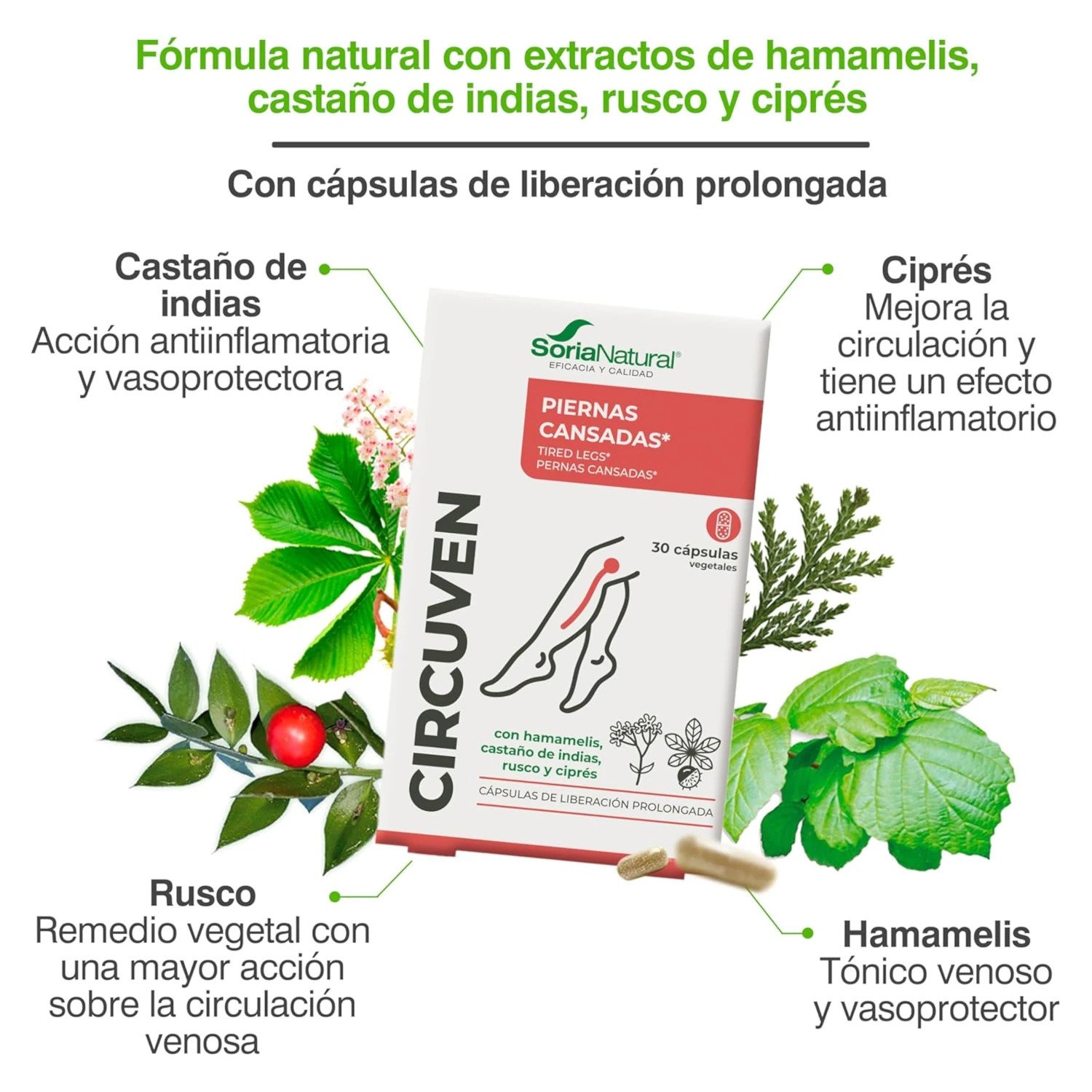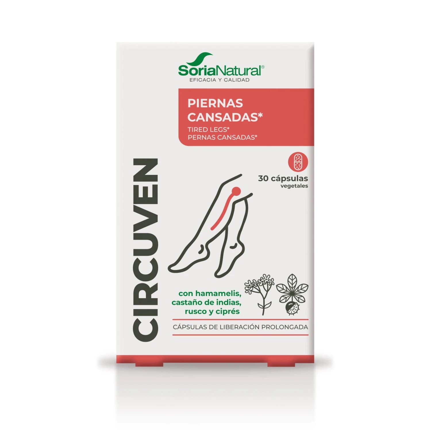 Circuven de Soria Natural es un complemento alimenticio diseñado para mejorar la circulación sanguínea y aliviar la sensación de piernas cansadas. Su fórmula incluye extractos naturales de hamamelis, castaño de indias, rusco y ciprés, ingredientes conocidos por sus propiedades beneficiosas para la salud vascular. Este producto contribuye a reducir la aparición de varices, prevenir su desarrollo y aliviar los síntomas asociados con la insuficiencia venosa.