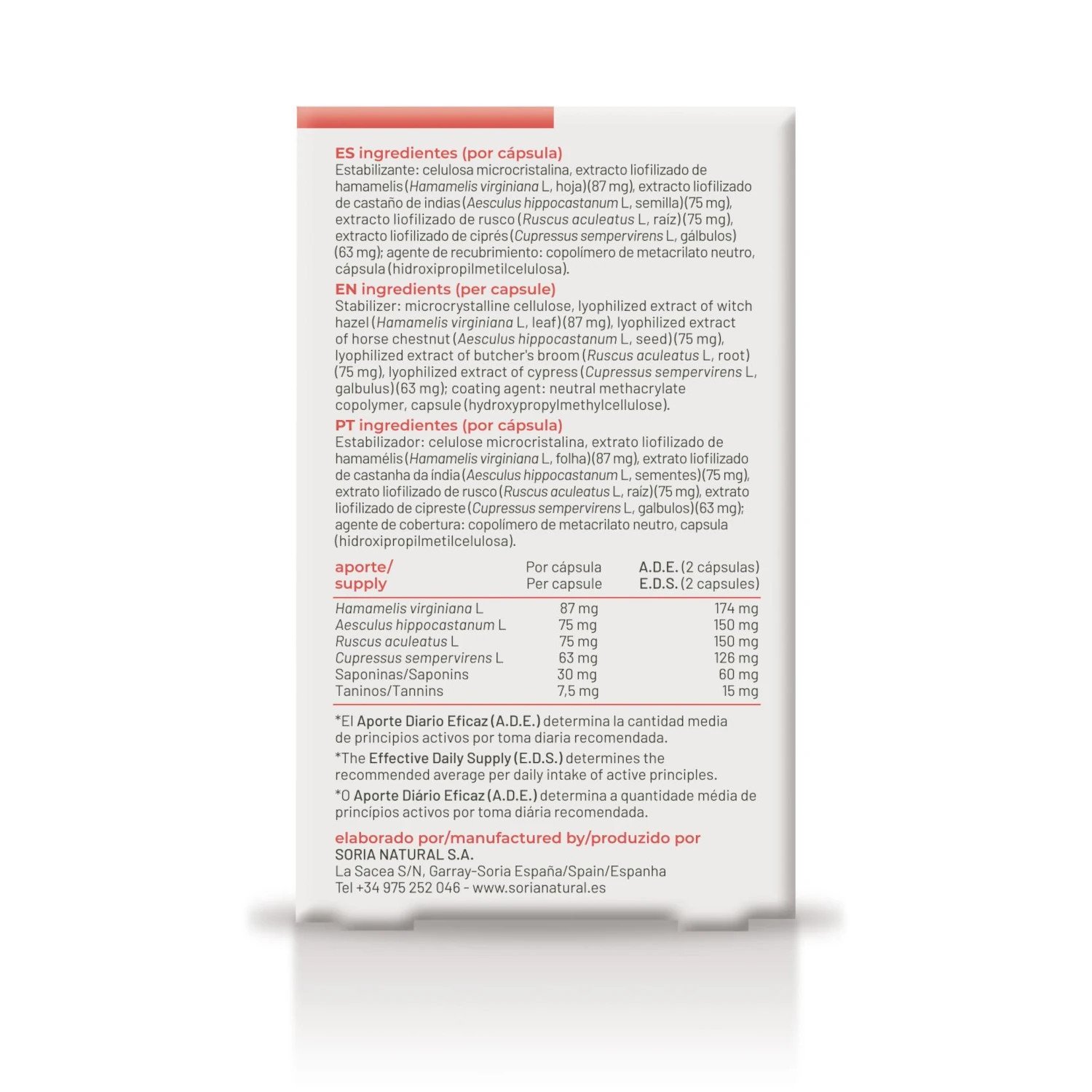 Estabilizante: celulosa microcristalina, extracto liofilizado de hamamelis (Hamamelis virginiana L) (hoja) (87 mg), extracto liofilizado de castaño de indias (Aesculus hippocastanum L) (semilla) (75 mg), extracto liofilizado de rusco (Ruscus aculeatus L) (raíz) (75 mg), extracto liofilizado de ciprés (Cupressus sempervirens L) (gálbulos) (63 mg), agente de recubrimiento: copolímero de metacrilato neutro, cápsula (hidroxipropilmetilcelulosa).
