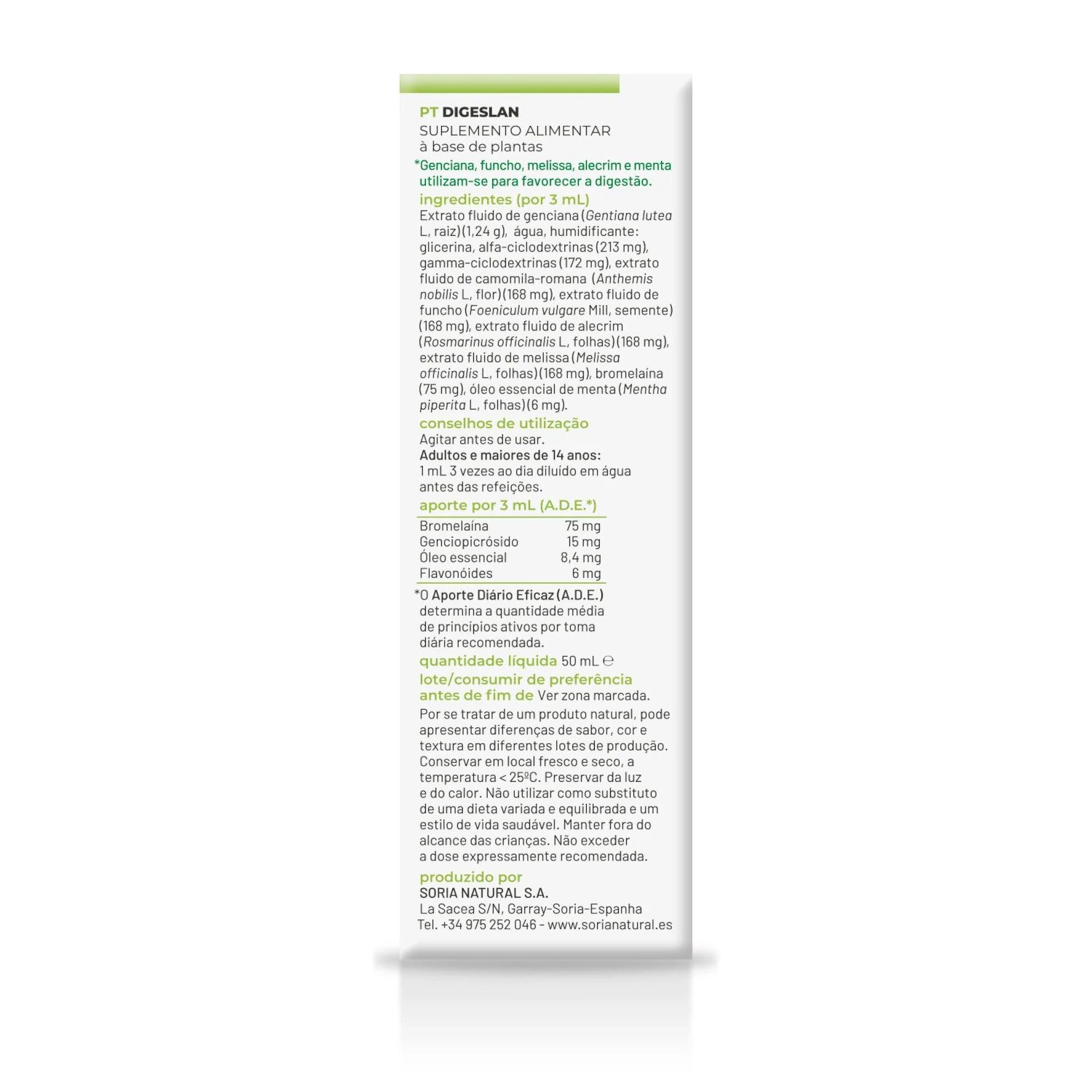 Extracto fluido de Genciana (Gentiana lutea L, raíz ) (1,24 g), agua, humectante: glicerina, alfa-ciclodextrinas (213 mg), gamma-ciclodextrinas (172 mg), extracto fluido de Manzanilla amarga (Anthemis nobilis L, flor) (168 mg), extracto fluido de Hinojo (Foeniculum vulgare L, semilla) (168 mg), extracto fluido de Romero (Rosmarinus officinalis L, hojas) (168 mg) , extracto fluido de Melisa (Melissa officinalis L, hojas ) (168 mg), bromelaína (75 mg), aceite esencial de Menta (Mentha piperita L, hojas) (6 mg).
