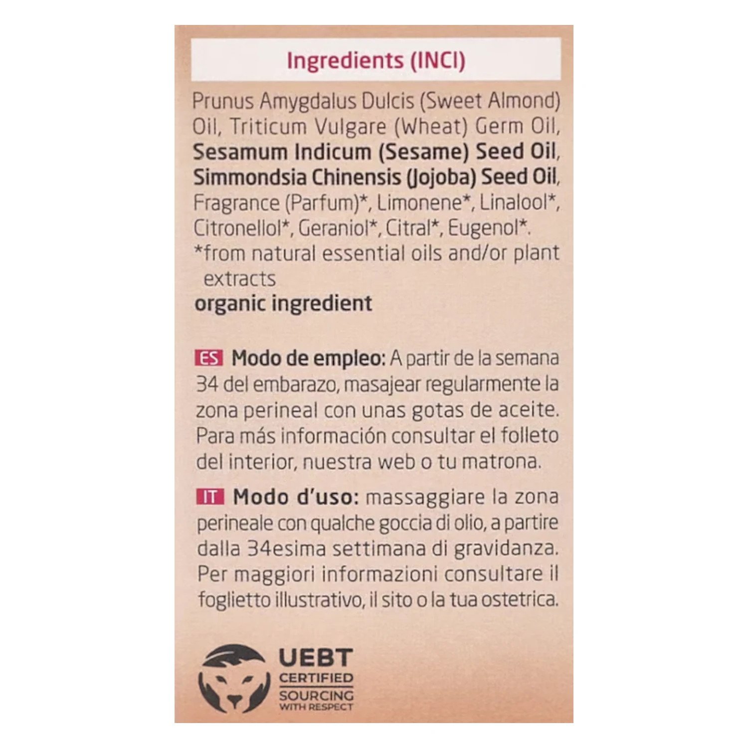 · La composición de aceite de Almendra Dulce y aceite de Germen de Trigo, ricos en vitamina E, permite un masaje suave, dando elasticidad al tejido del perineo.