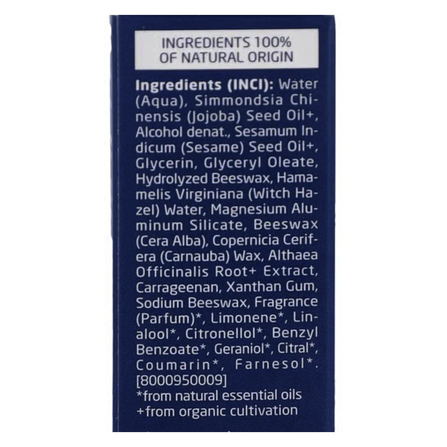 Water (Aqua), Simmondsia Chinensis (Jojoba) Seed Oil, Sesamum Indicum (Sesame) Seed Oil, Alcohol, Hamamelis Virginiana (Witch Hazel) Distillate, Glycerin, Glyceryl Oleate, Hydrolyzed Beeswax, Magnesium Aluminum Silicate, Althaea Officinalis Root Extract, Xanthan Gum, Beeswax (Cera Flava), Copernicia Cerifera (Carnauba) Wax, Sodium Beeswax, Chondrus Crispus (Carrageenan), Fragrance (Parfum)*, Limonene*, Linalool*, Benzyl Benzoate*, Geraniol*, Citral*, Coumarine*, Farnesol*.