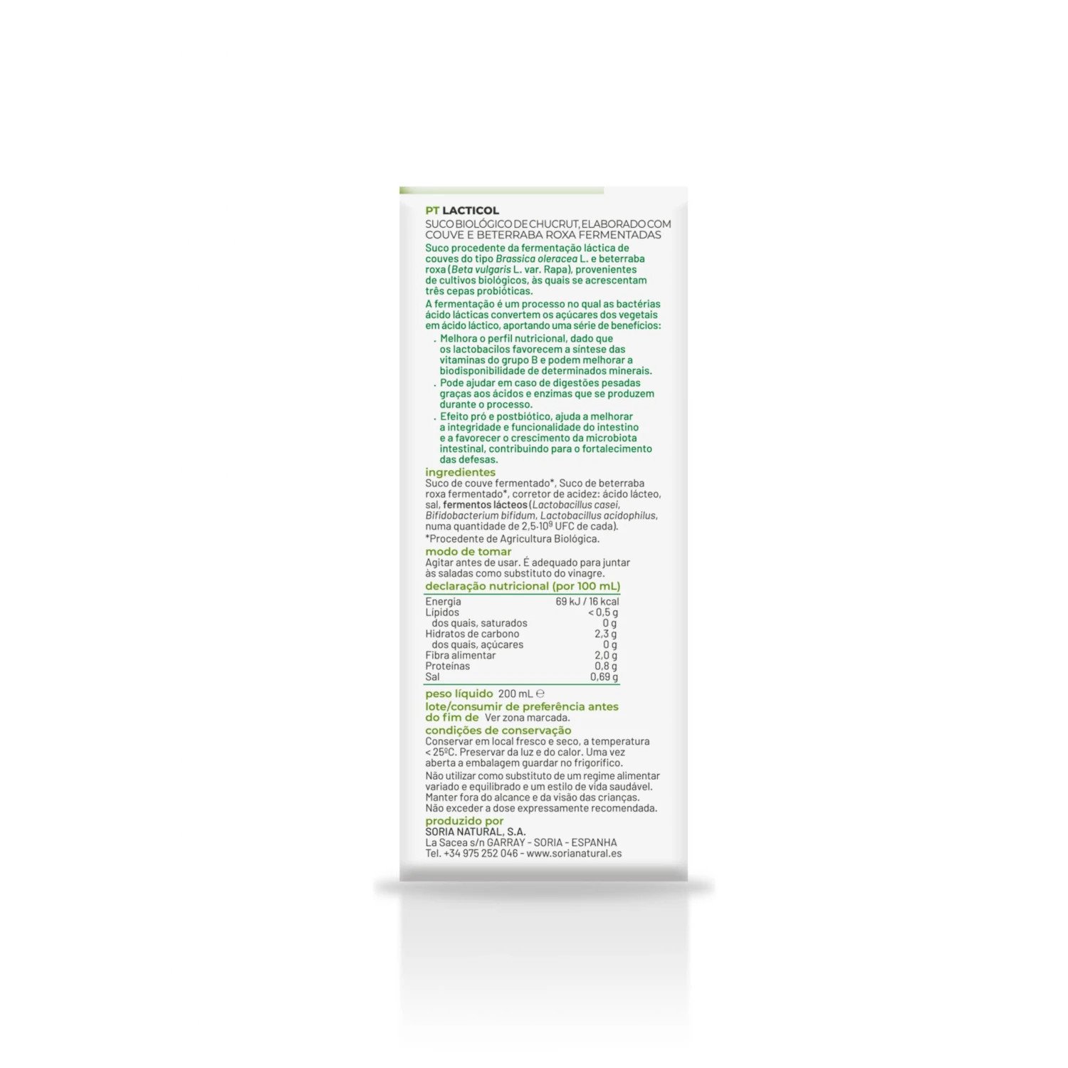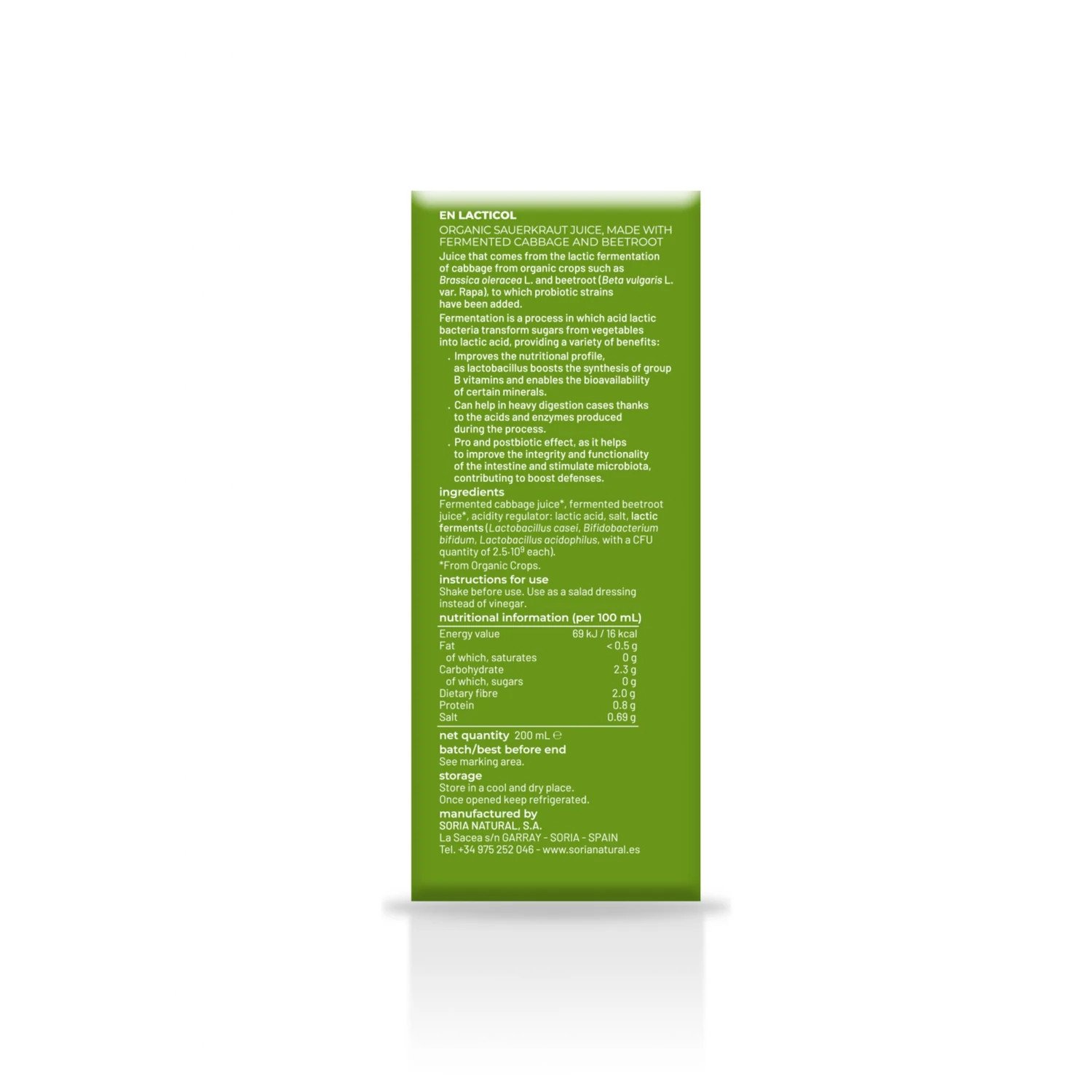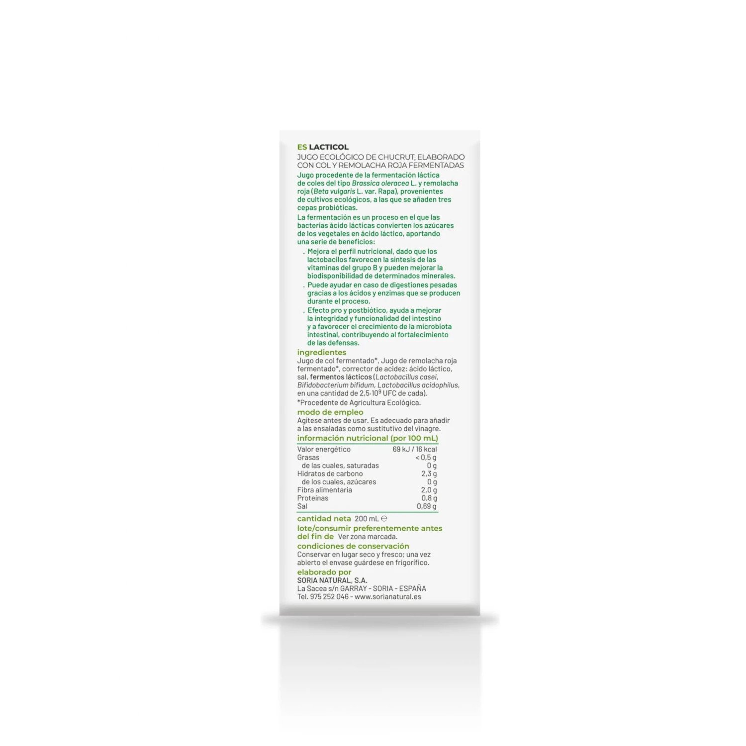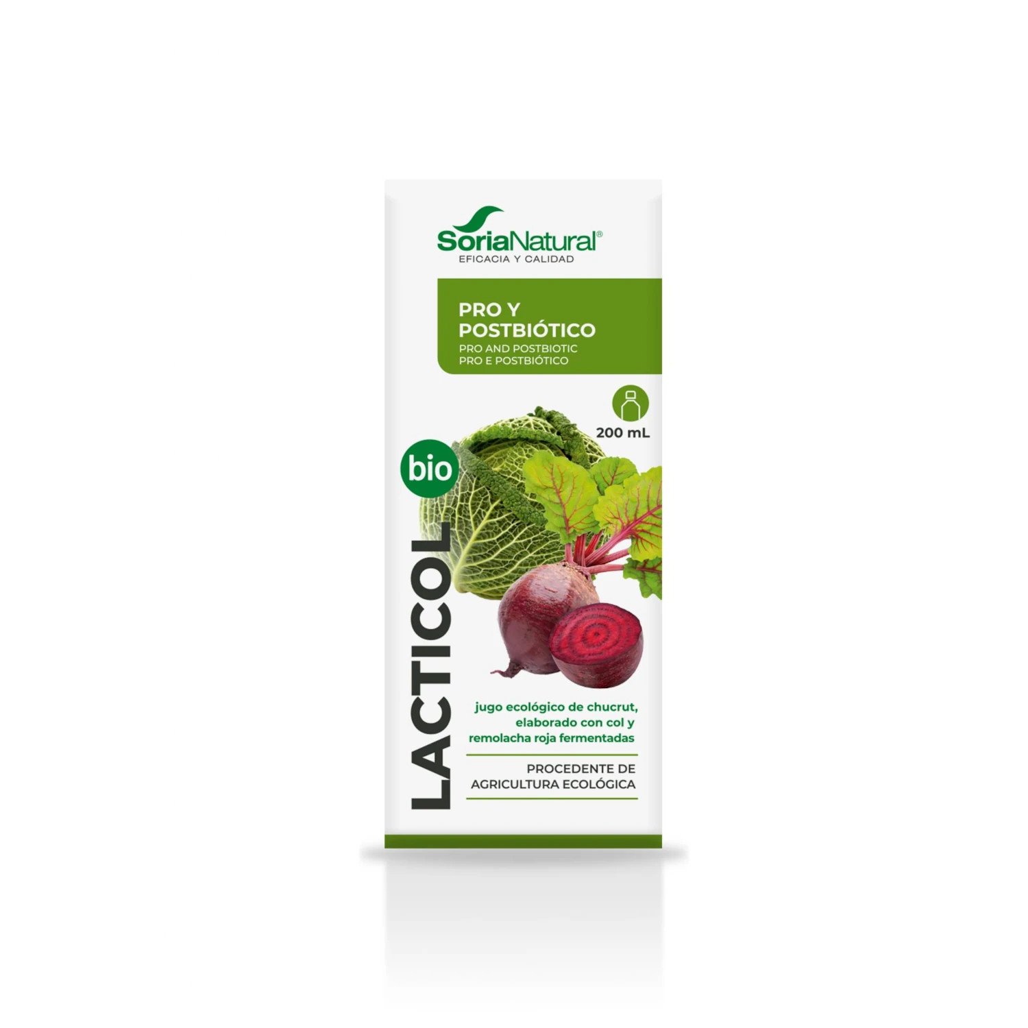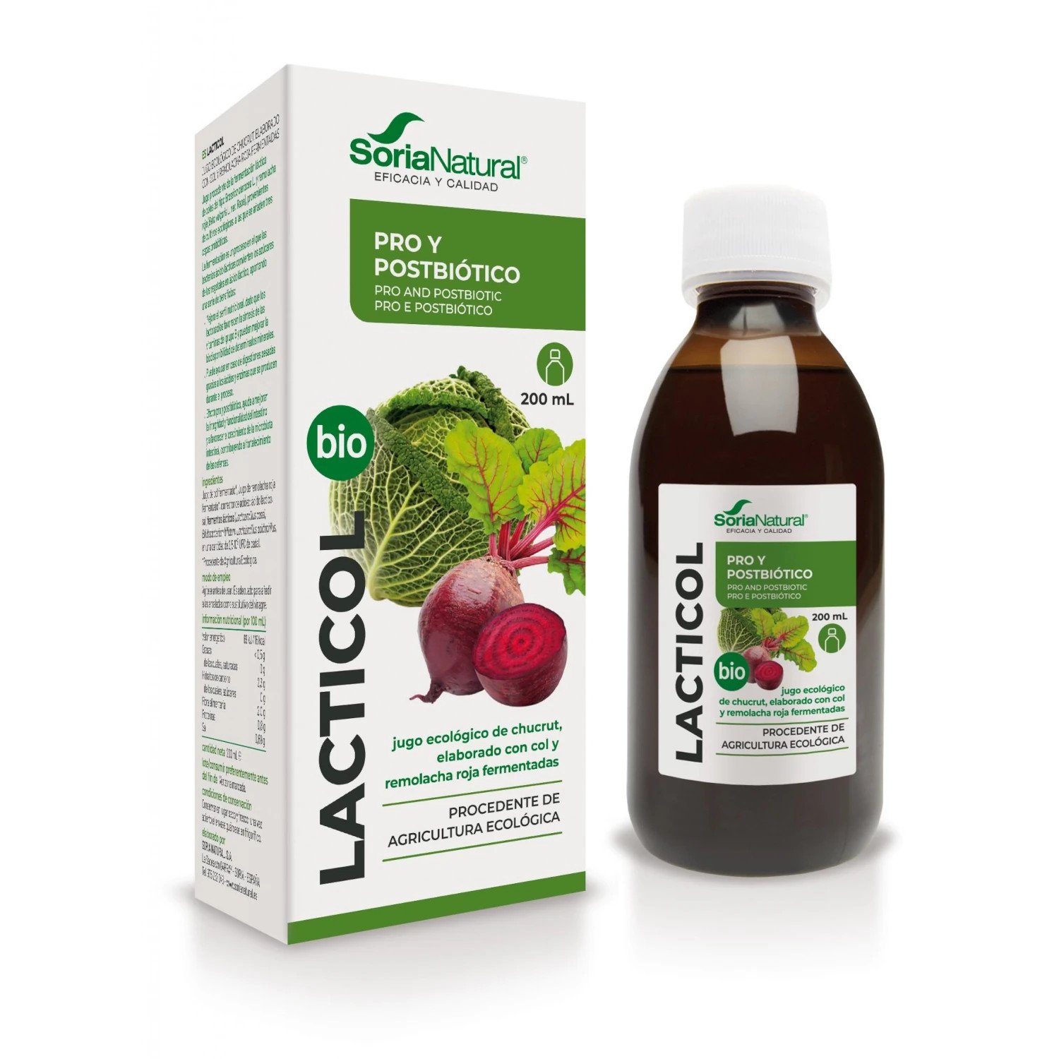 Lacticol Bio de Soria Natural es un producto elaborado a partir de la fermentación láctica de coles (Brassica oleracea L.) y remolacha roja (Beta vulgaris L. var. rapa), provenientes de cultivos ecológicos certificados. Este jugo fermentado se enriquece con tres cepas probióticas: Lactobacillus acidophilus, Lactobacillus casei y Bifidobacterium bifidum, conocidas por sus beneficios en el equilibrio de la microbiota intestinal.