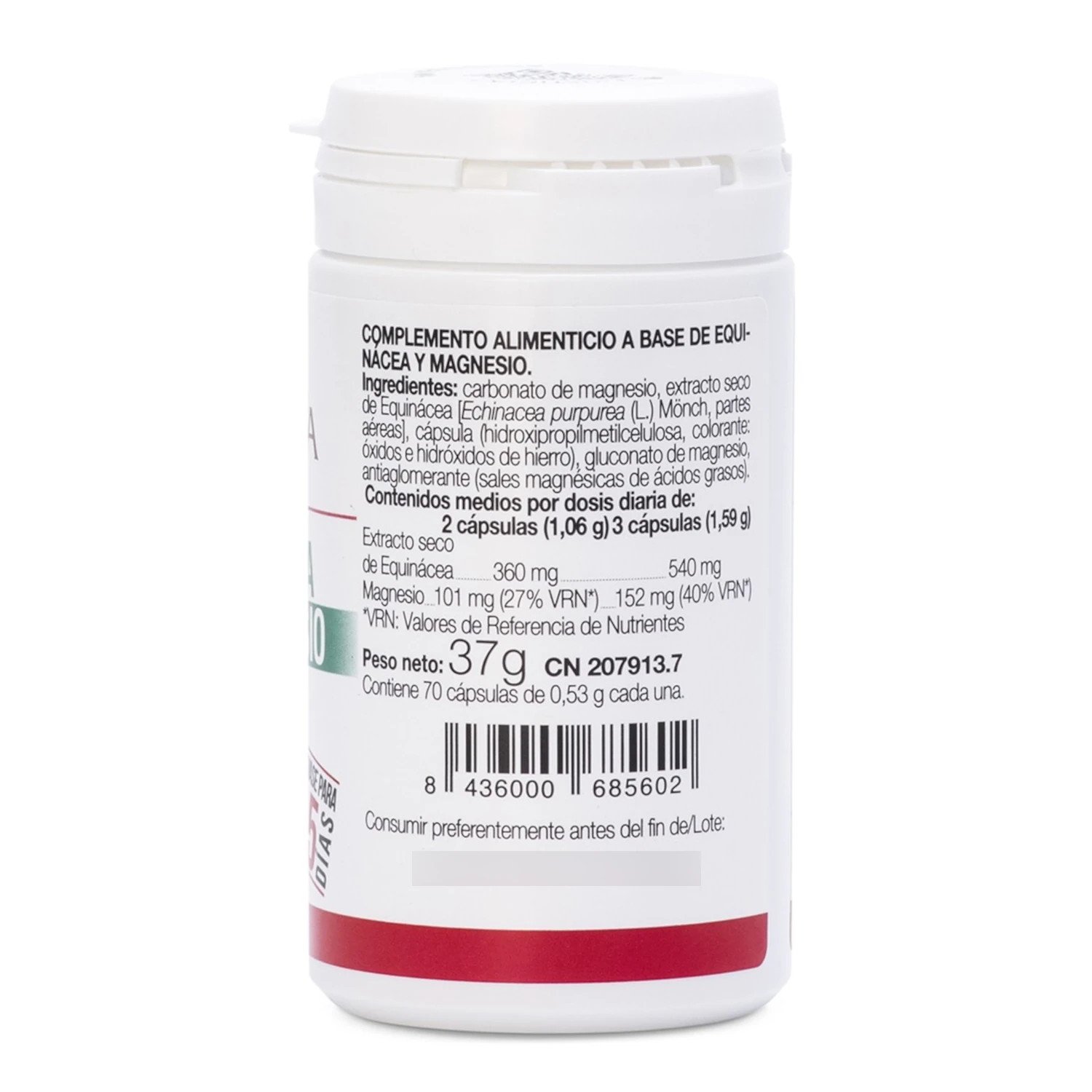 · 3 cápsulas (1,59 g): extracto seco de Equinácea 540 mg, magnesio 152 mg (40% VRN*).
