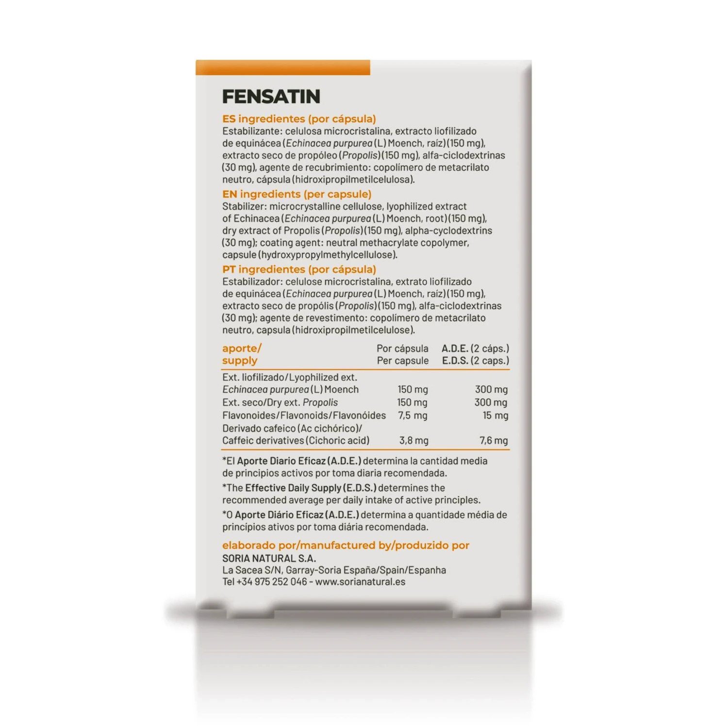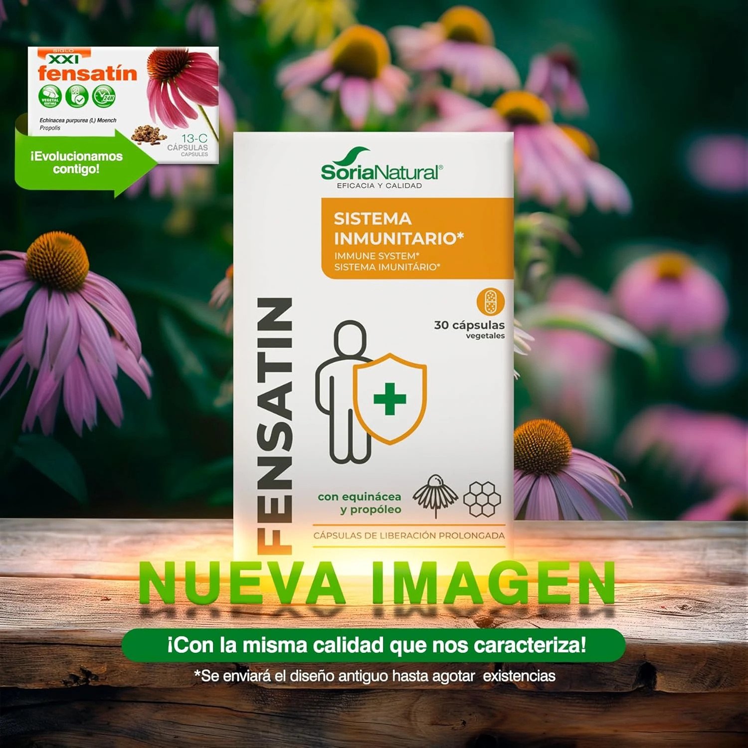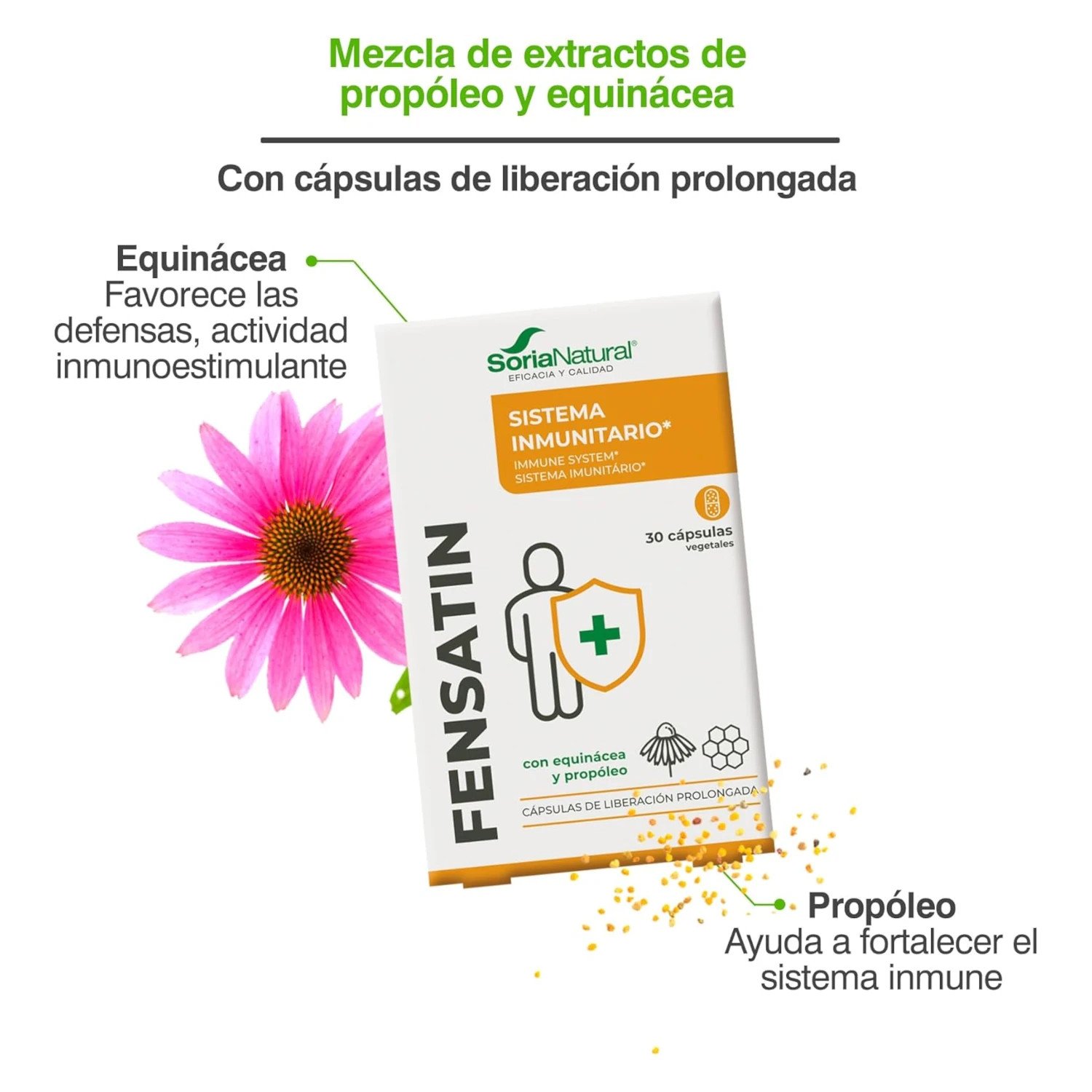 Fensatín de Soria Natural es un suplemento natural diseñado para fortalecer el sistema inmunológico y aumentar las defensas del organismo. Su fórmula combina propóleo y equinácea, dos ingredientes naturales reconocidos por sus propiedades beneficiosas para la salud. El propóleo, producido por las abejas, contiene compuestos antioxidantes como flavonoides y aminoácidos, conocidos por sus efectos antisépticos y antiinflamatorios. Por otro lado, la equinácea, utilizada tradicionalmente en la medicina natural, es destacada por su capacidad para fortalecer el sistema inmune gracias a sus componentes fenólicos.