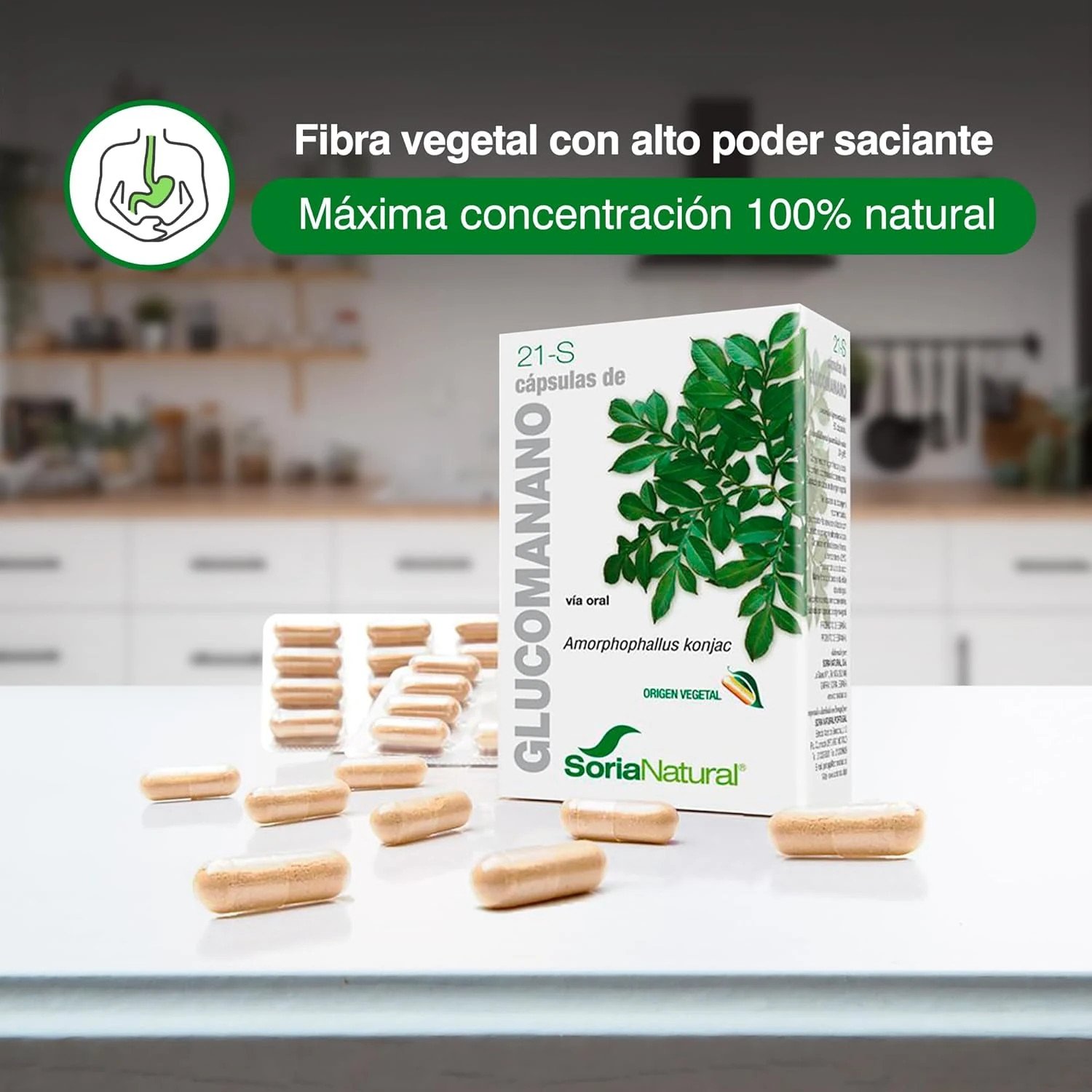 21-S Glucomanano de Soria Natural es un complemento alimenticio elaborado a base de glucomanano, una fibra vegetal extraída de la raíz de la planta Amorphophallus konjac, originaria de Japón. Este compuesto destaca por su capacidad excepcional para absorber agua, lo que lo convierte en un aliado eficaz para generar una sensación prolongada de saciedad y apoyar el control del apetito. Gracias a estas propiedades, el glucomanano es ampliamente utilizado en programas de manejo de peso.
