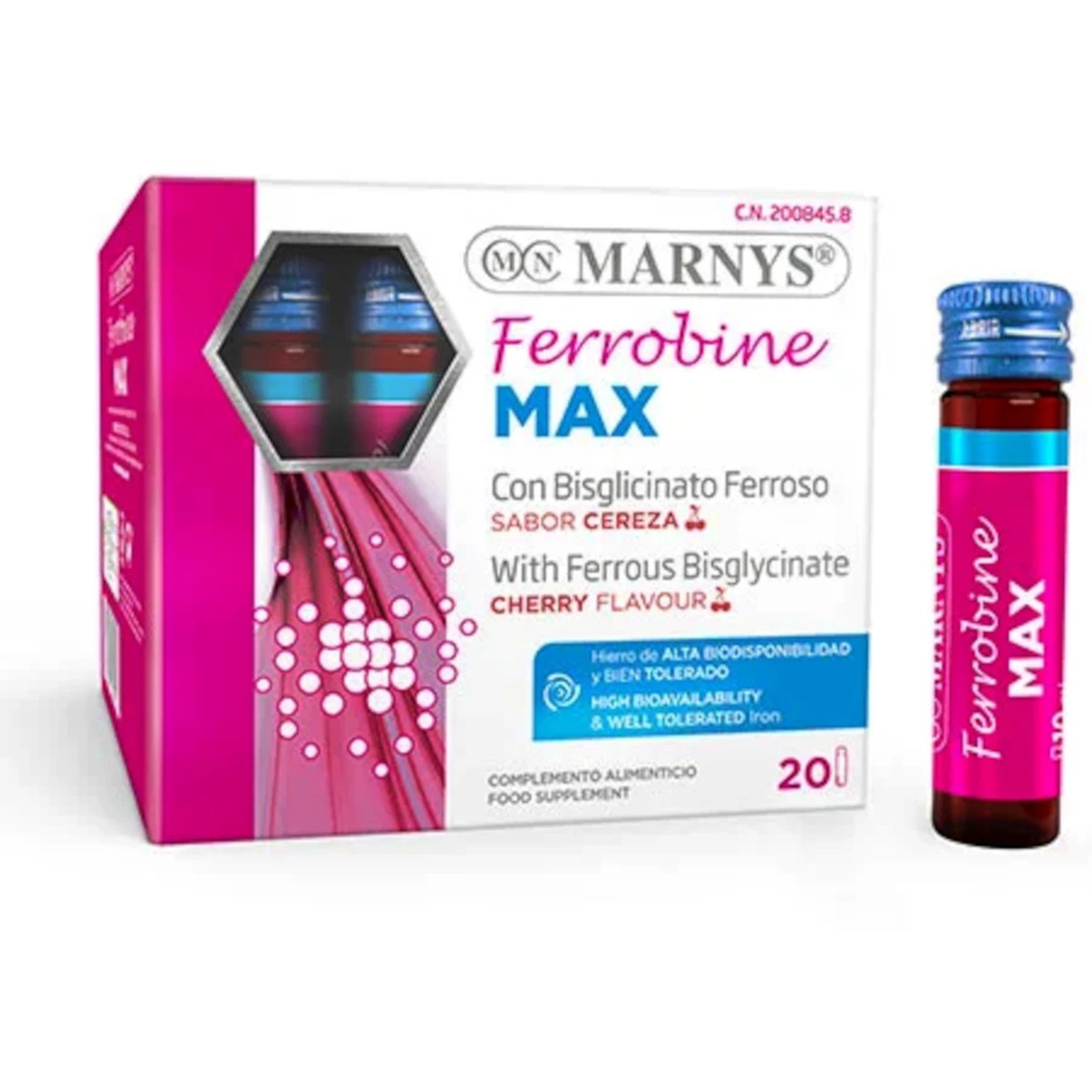 Ferrobine MAX de Marnys es un suplemento de hierro en forma de bisglicinato ferroso, altamente biodisponible y estable. Este innovador producto se presenta en un formato bebible monodosis con un agradable sabor a cereza, lo que lo hace práctico y cómodo de tomar.