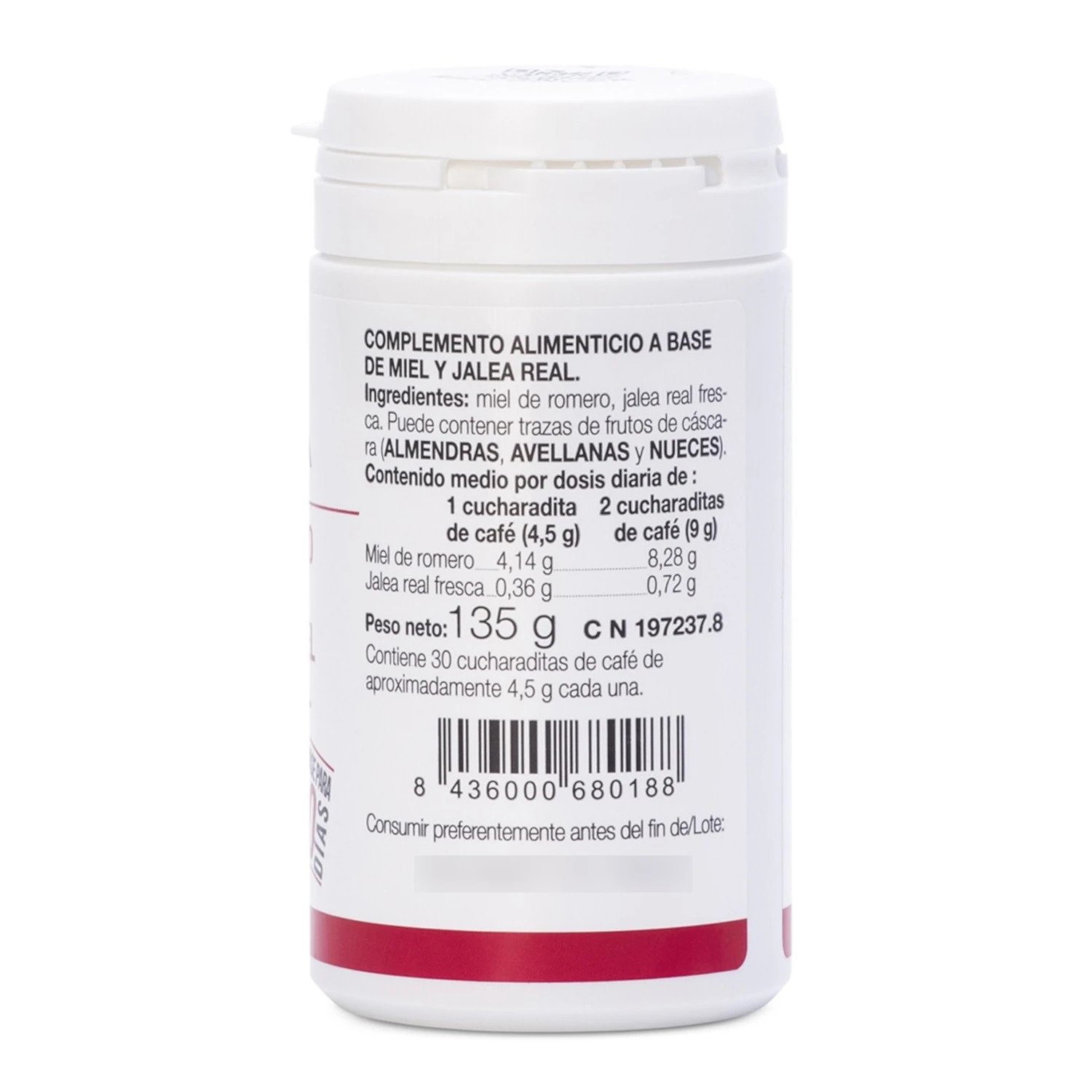 · Ingredientes Naturales: Contiene miel de romero y jalea real fresca, enriquecido con vitaminas del grupo B, hierro, fósforo y calcio. Estos ingredientes han sido cuidadosamente seleccionados por sus propiedades nutricionales, ofreciendo un complemento de alta calidad.