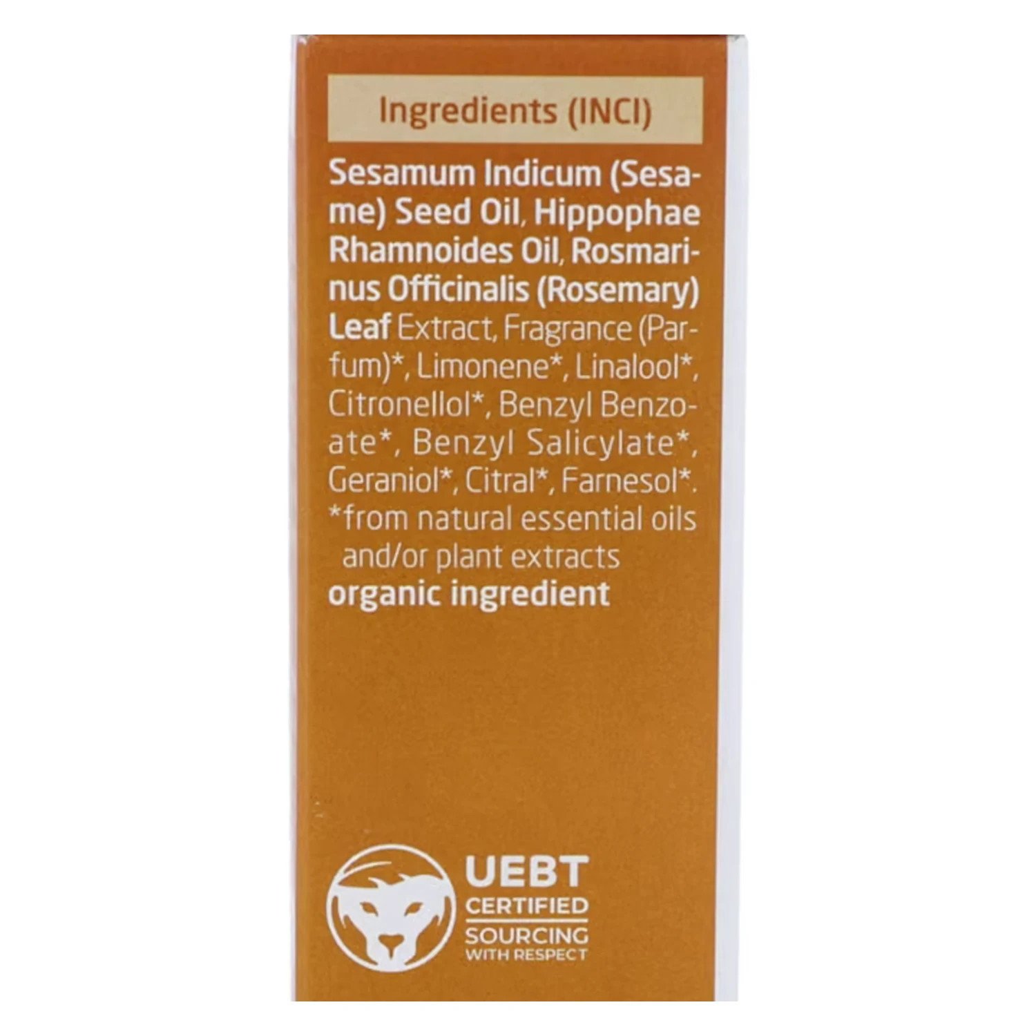 Sesamum Indicum (Sesame) Seed Oil, Hippophae Rhamnoides Oil, Fragrance (Parfum), Limonene, Linalool, Benzyl Benzoate, Benzyl Salicylate, Geraniol, Citral, Farnesol.