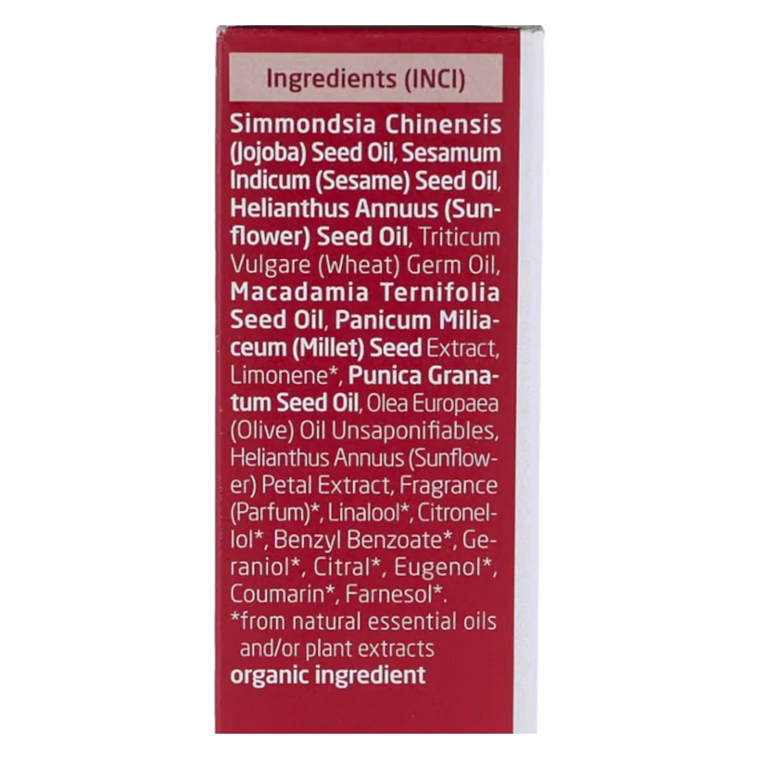 Simmondsia Chinensis Seed Oil, Sesamum Indicum Seed Oil, Helianthus Annuus Seed Oil, Triticum Vulgare Germ Oil, Macadamia Ternifolia Seed Oil, Panicum Miliaceum Seed Extract, Limonene, Punica Granatum Seed Oil, Olea Europaea Oil Unsaponifiables, Helianthus Annuus Petal Extract, Fragrance, Linalool, Citronellol, Geraniol, Citral, Eugenol, Coumarin, Farnesol.