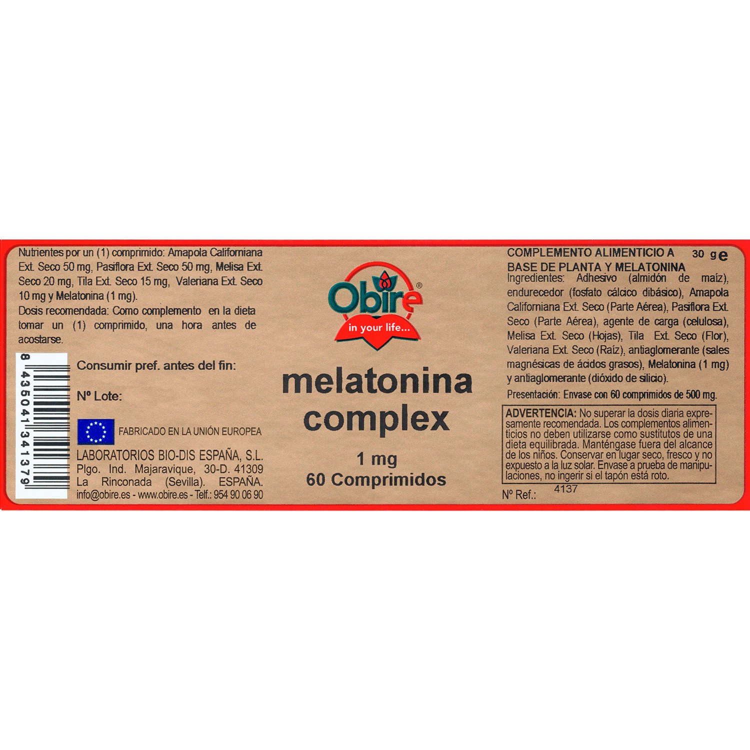 Melatonina complex de Obire es un suplemento formulado con extractos secos de plantas reconocidas por sus propiedades para promover un sueño reparador y aliviar los síntomas del Jet-lag. Entre los ingredientes de esta fórmula se encuentran la valeriana, amapola californiana, melisa, pasiflora y tila, todos ellos conocidos por sus efectos relajantes y calmantes.