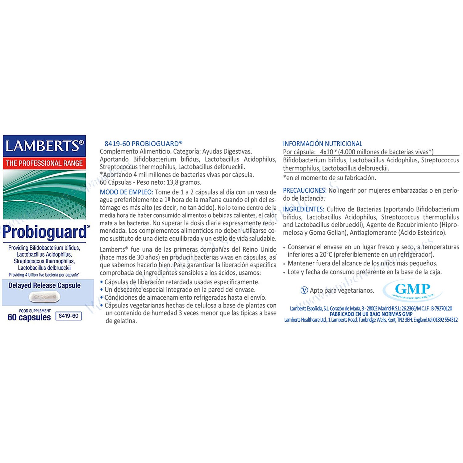 El envase especial de Probioguard® también merece destacarse, ya que incorpora un desecante integrado que protege las cápsulas de la humedad ambiente, un factor crucial para preservar la viabilidad de las bacterias. Este diseño elimina la necesidad de incluir una bolsa desecante adicional, asegurando la calidad del producto hasta su consumo.