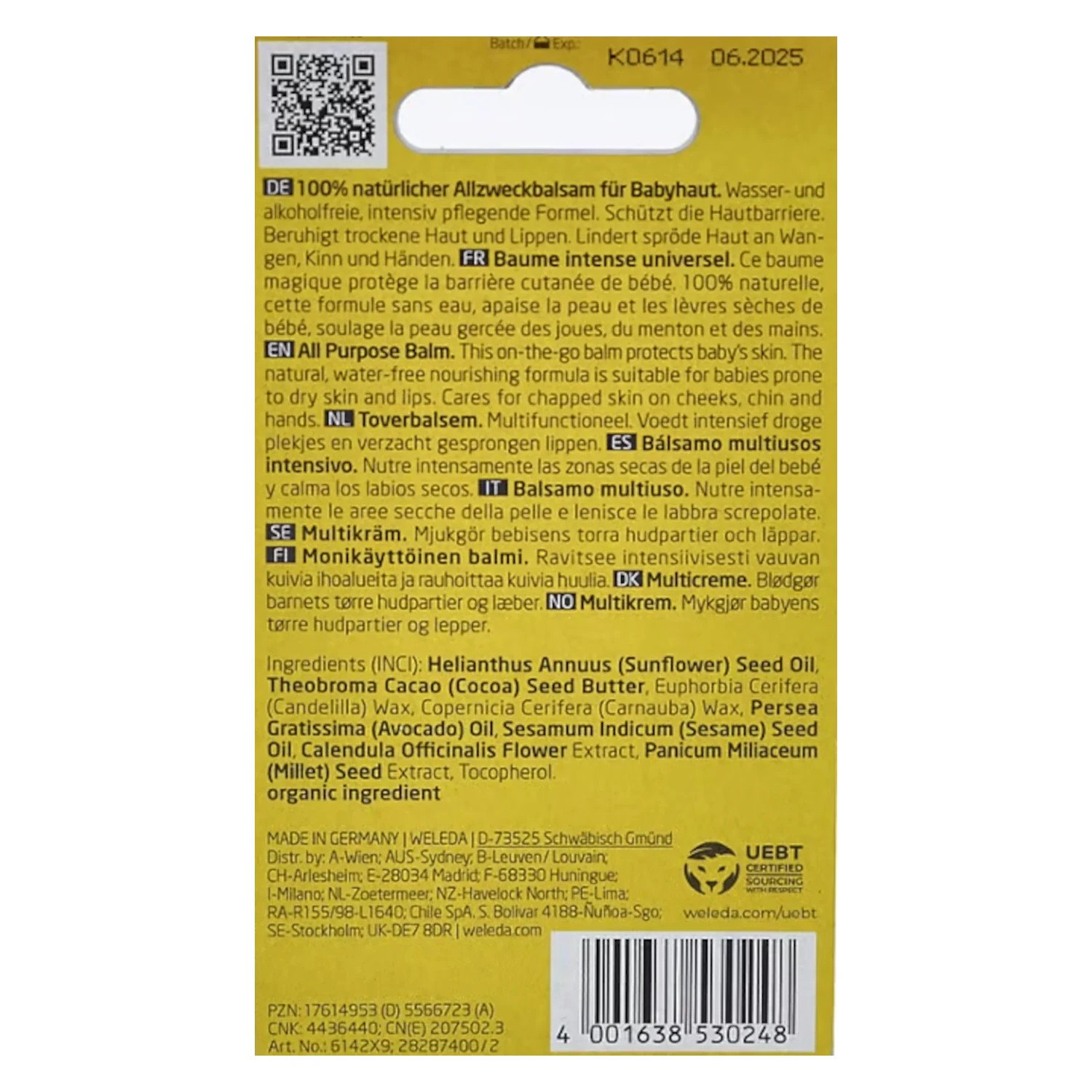 Aceite de semilla de Helianthus Annuus (girasol), mantequilla de semilla de Theobroma Cacao (cacao), cera de Euphorbia Cerifera (Candelilla), cera de Copernicia Cerifera (Carnauba), aceite de Persea gratissima (aguacate), aceite de semilla de Sesamum Indicum (sésamo) , extracto de flor de caléndula officinalis, extracto de semilla de panicum miliaceum (mijo), tocoferol.