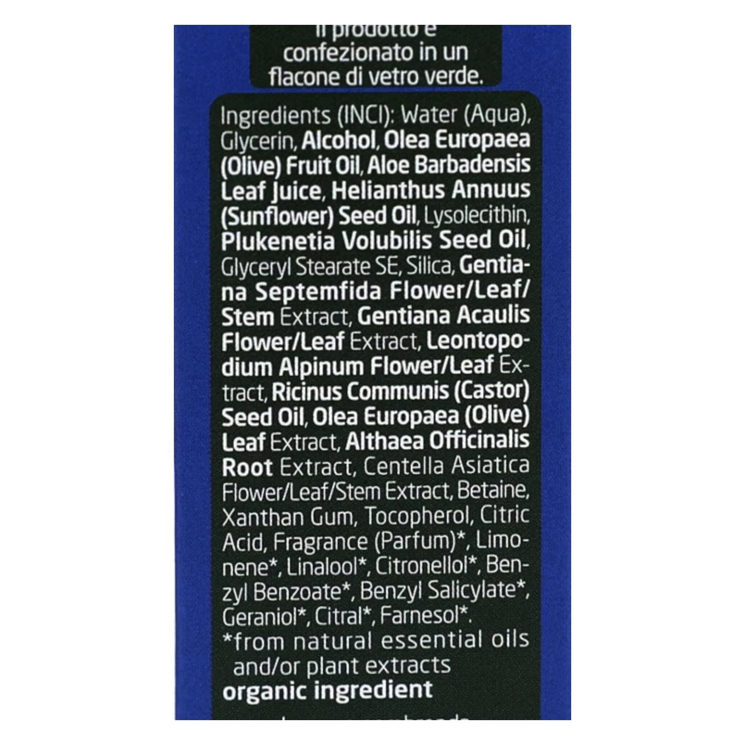 Agua, Glicerina, Alcohol, Aceite de Hueso de Oliva, Zumo de Aloe Vera, Aceite de Semilla de Girasol, Lisolecitina, Aceite de Semilla de Plukenetia Volubilis, Gliceril Estearato SE, Sílice, Extracto de Flor/Hoja/Tallo de Gentiana Septemfida, Extracto de Flor/Hoja de Gentiana Acaulis, Extracto de Flor/Hoja de Leontopodium Alpinum, Aceite de Ricino, Extracto de hoja de Olivo, Extracto de raíz de Althaea Officinalis, Extracto de flor/hoja/tallo de Centella Asiática, Betaína, Goma xantana, Tocoferol, Ácido cítrico, Fragancia (Parfum)*, Limoneno*, Linalol*, Citronelol*, Benzoato de bencilo*, Salicilato de bencilo*, Geraniol*, Citral*, Farnesol*.