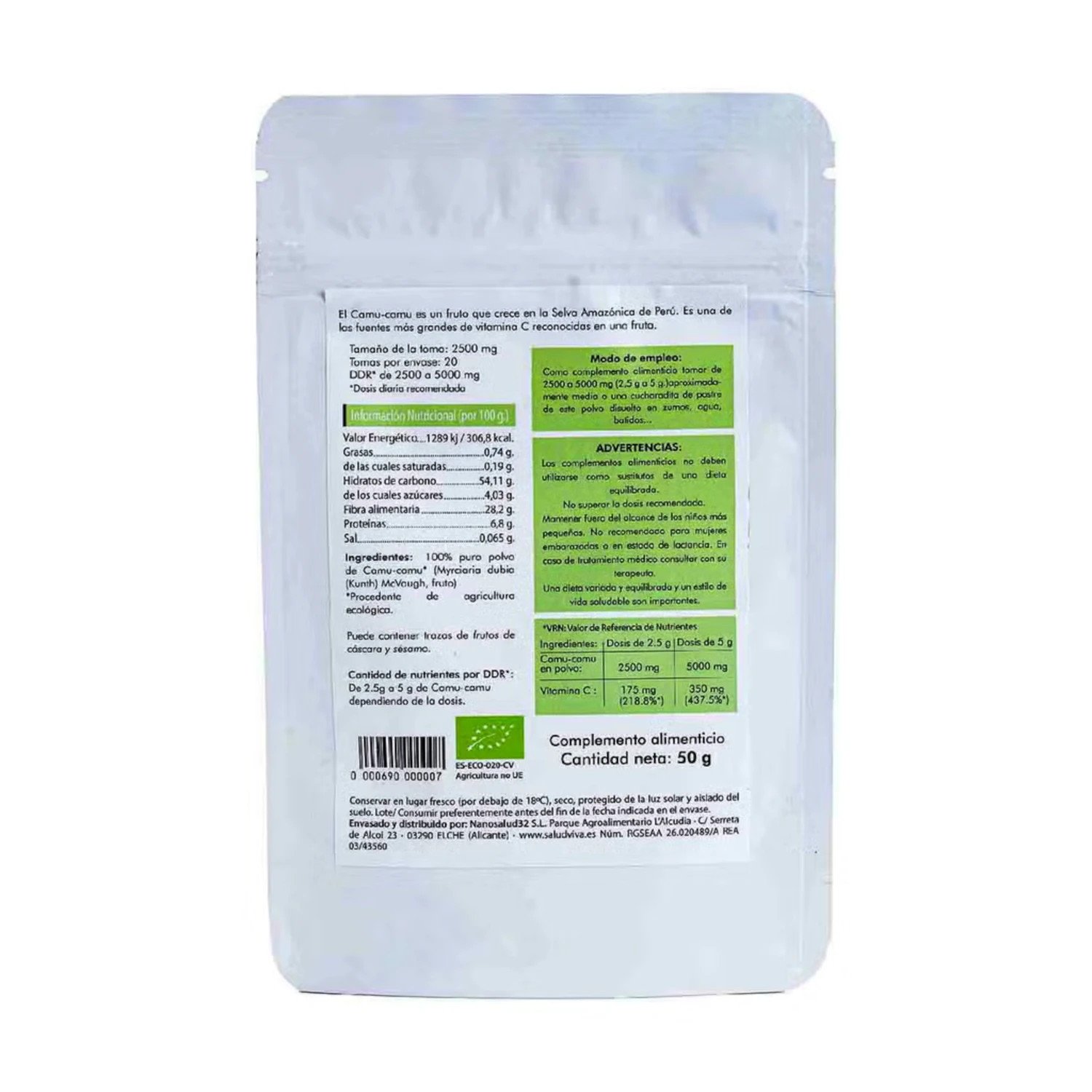 Camu Camu Eco de Salud Viva es un superalimento de origen amazónico destacado por su excepcional concentración de vitamina C, una de las más altas reconocidas en fuentes naturales. Este fruto es esencial para la formación de colágeno, contribuyendo al mantenimiento de huesos, piel, dientes y encías saludables, además de fortalecer los vasos sanguíneos. Su riqueza en vitamina C también lo convierte en un potente antioxidante, capaz de proteger las células del estrés oxidativo y combatir el envejecimiento prematuro.