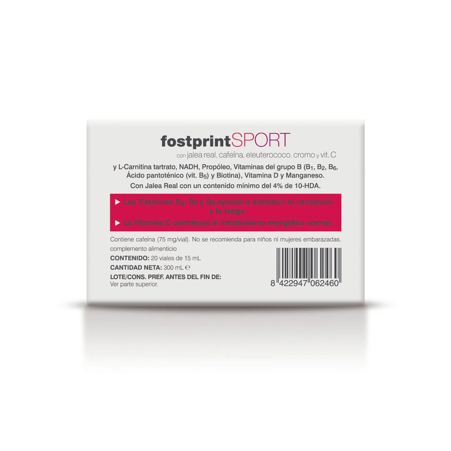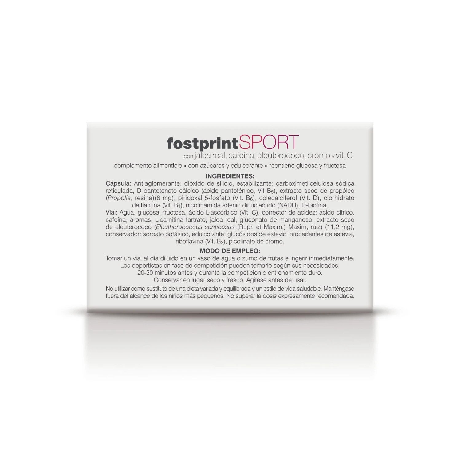 Fost Print Sport formulado con Jalea Real, Cafeína, Eleuterococo, Cromo, Vitamina C y L-Carnitina tartrato, NADH, Propóleo, Vitaminas del grupo B (B1, B2, B3, B6, Ácido pantoténico (Vit. B5) y Biotina), Vitamina D y Manganeso.