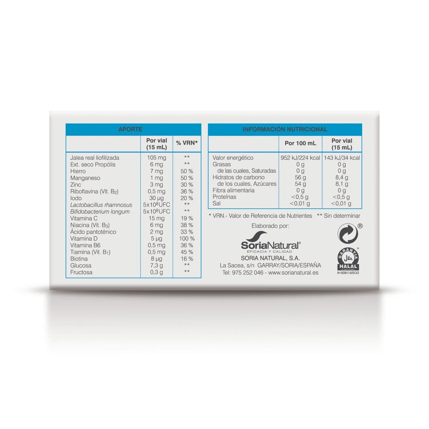 Con 105 mg de jalea real liofilizada (equivalente a 0,5 g de jalea real fresca), este producto asegura una ingesta adecuada de nutrientes esenciales para favorecer el bienestar general. Su combinación de ingredientes energizantes y nutritivos también incluye productos de la colmena como miel y propóleo, además de glucosa y fructosa, para potenciar sus efectos en el organismo.