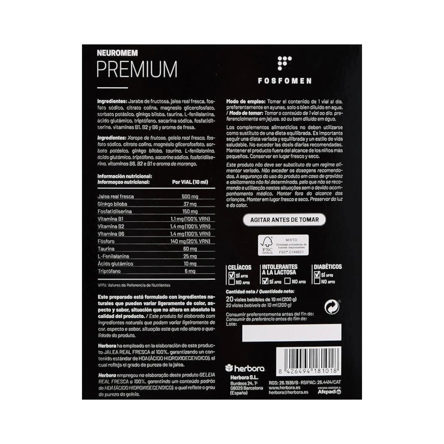 Neuromem Premium de Herbora es un complemento alimenticio diseñado para apoyar el correcto funcionamiento del sistema nervioso y la salud cerebral. Su fórmula incluye ingredientes clave como jalea real fresca, aminoácidos esenciales (taurina, fenilalanina, ácido glutámico y triptófano), ginkgo biloba, vitaminas, minerales y fosfatidilserina. Además, está libre de caseína láctica, lo que puede ser relevante para personas con ciertas intolerancias.