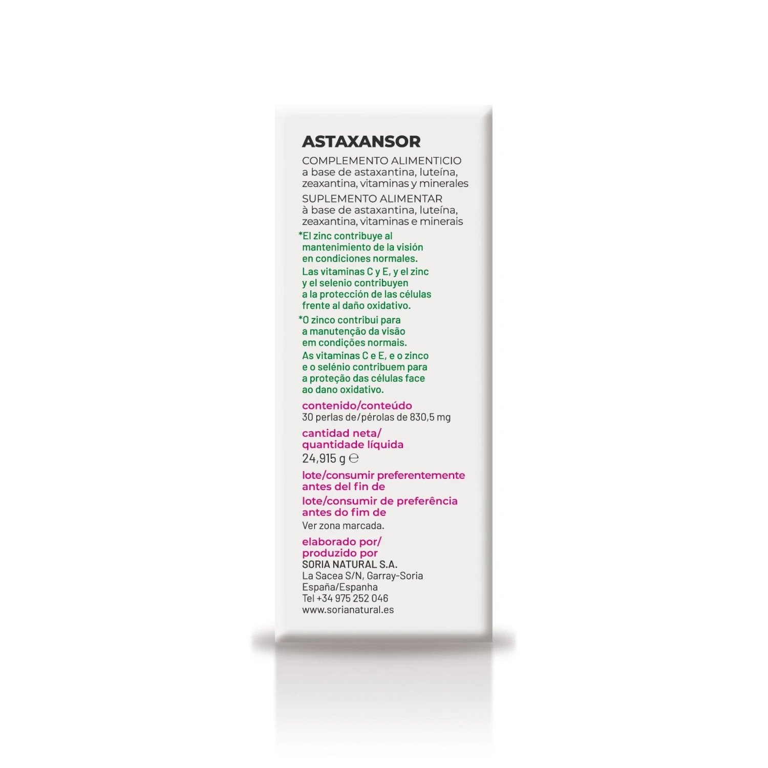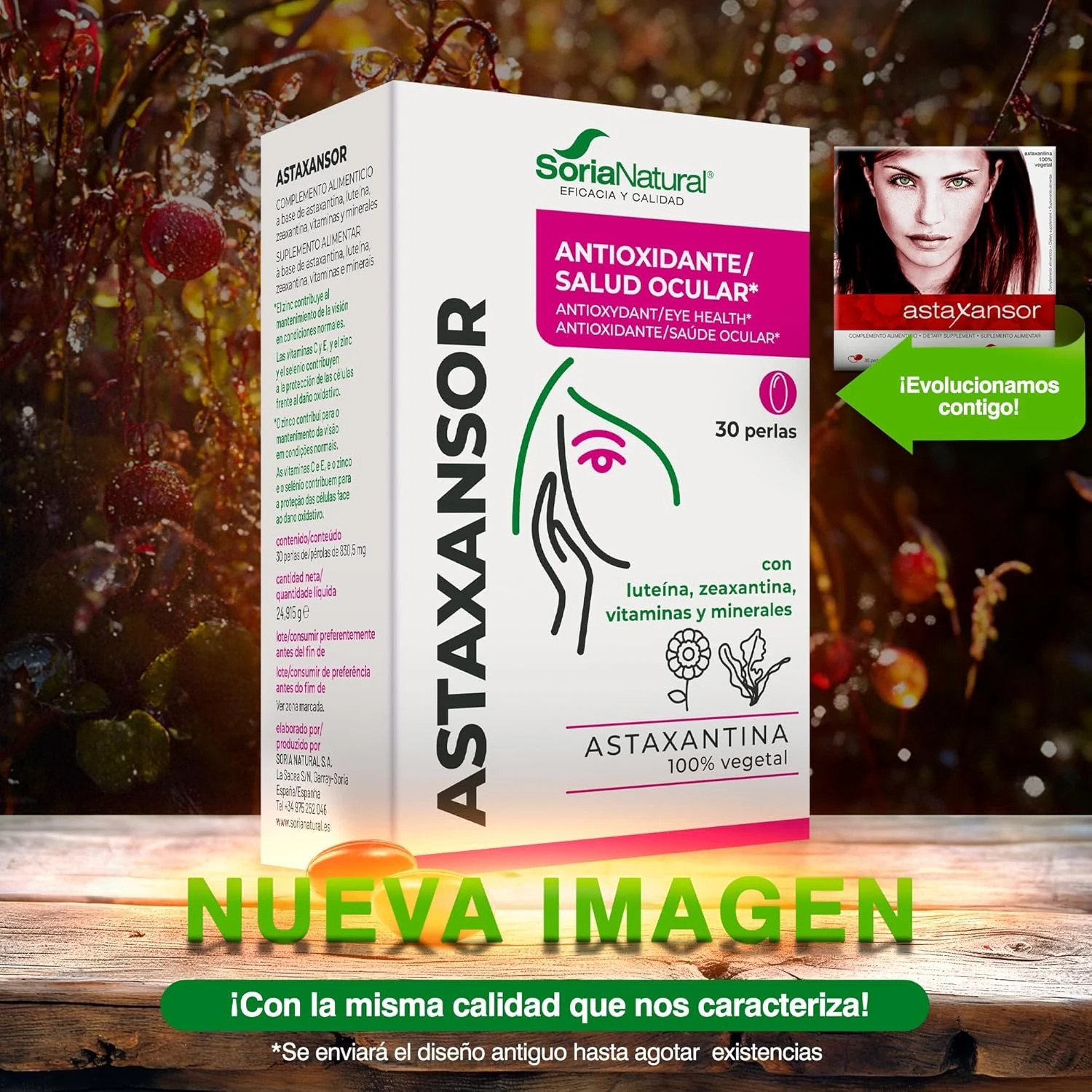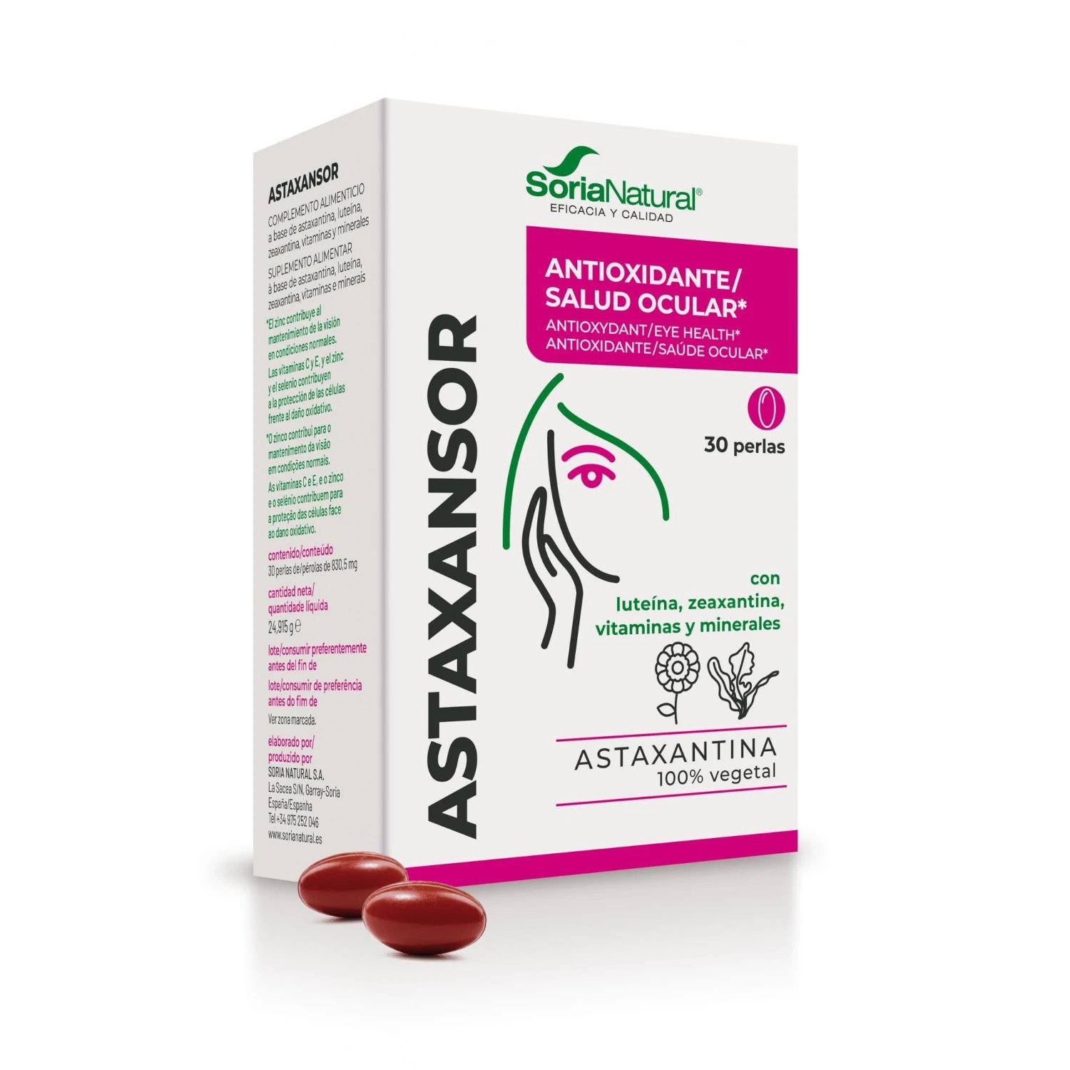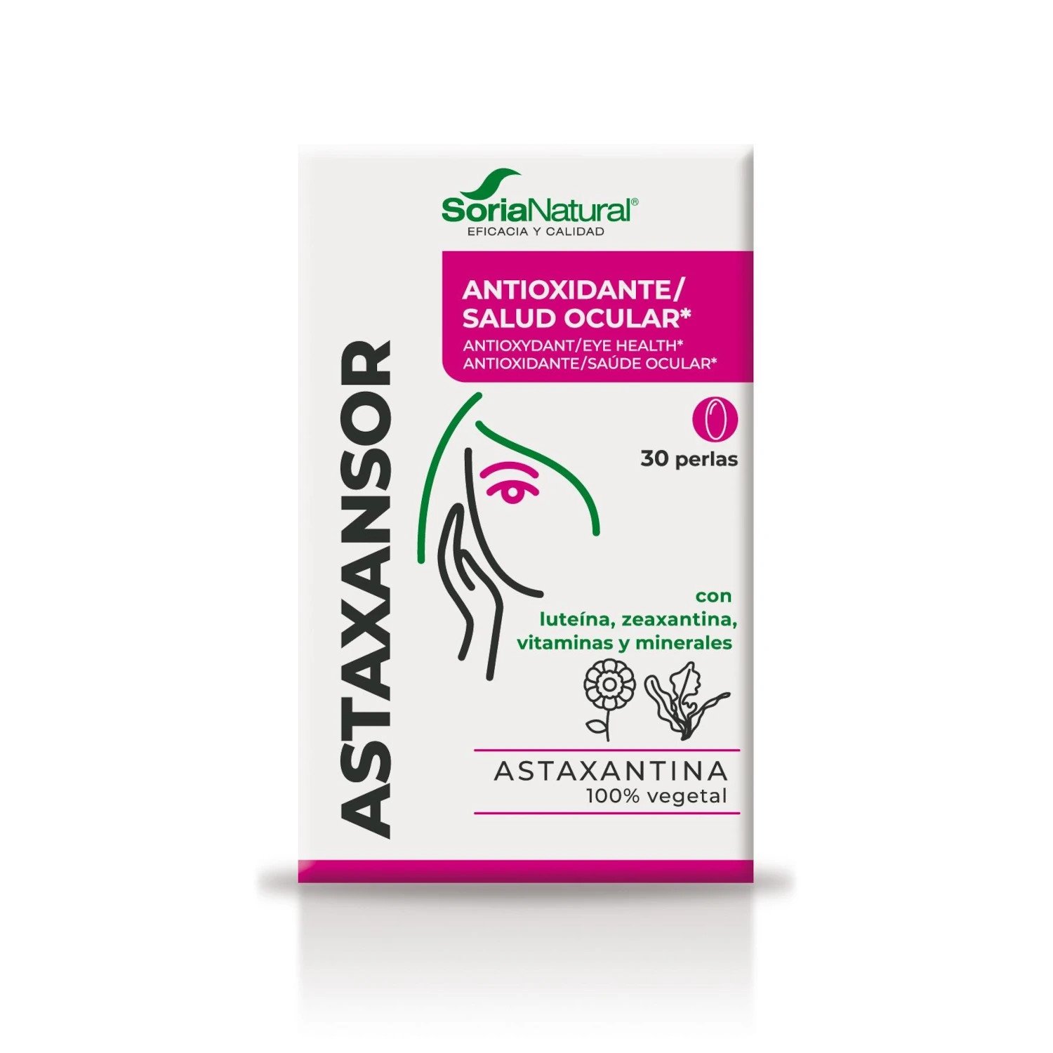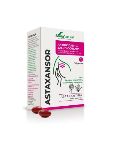 Astaxansor de Soria Natural es un innovador complemento alimenticio de origen 100% vegetal, diseñado para ofrecer una protección integral contra el daño oxidativo y mejorar la salud ocular y de la piel. Su fórmula avanzada combina astaxantina, luteína, zeaxantina, vitaminas C y E, selenio y zinc, todos ellos reconocidos por sus propiedades antioxidantes y beneficios para el organismo.