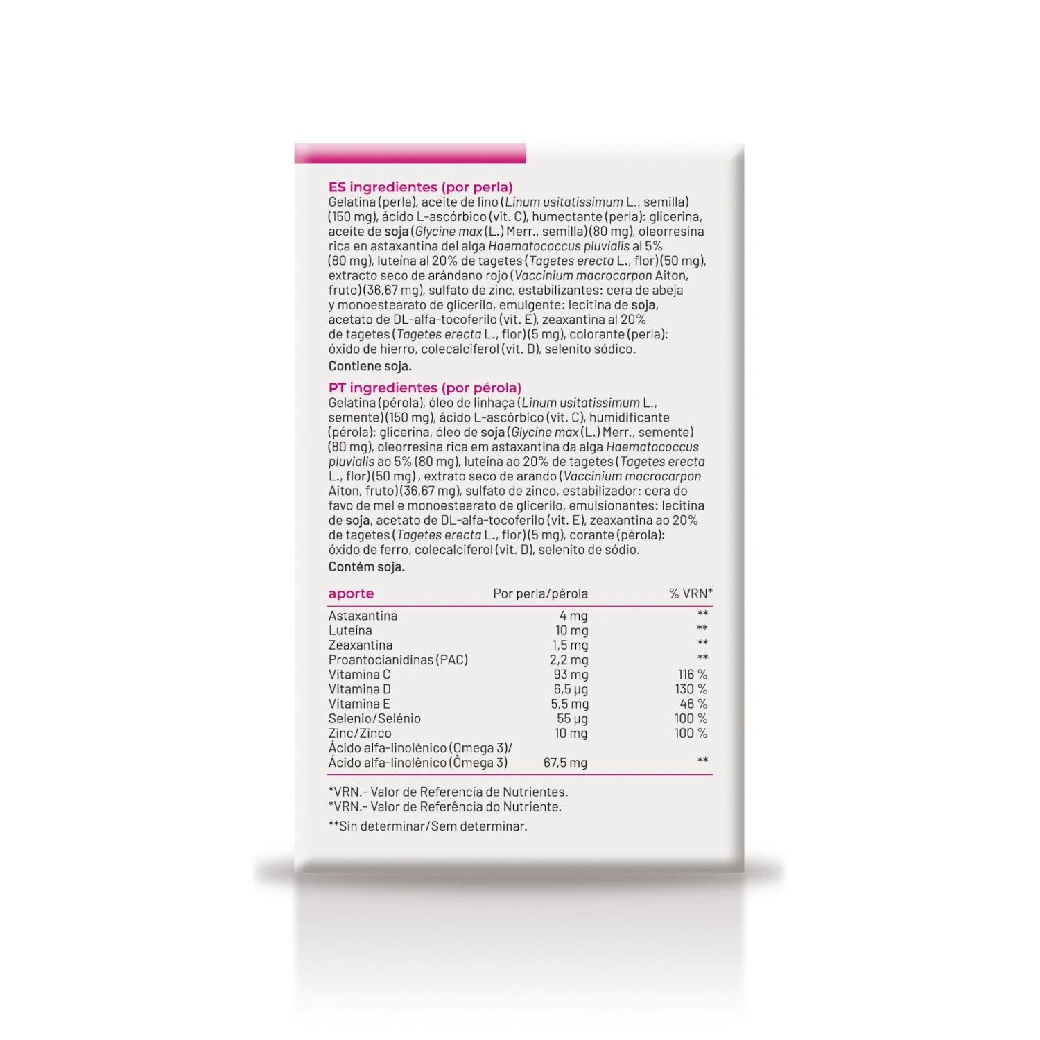 Gelatina (perla), aceite de lino (Linum usitatissimum. L , semilla ) (150 mg), ácido L-ascórbico (vitamina C), humectante (perla): glicerina, aceite de soja (Glycine max (L.) Merr., semilla) (80 mg) oleorresina rica en astaxantina del alga Haematococcus pluvialis al 5% (80 mg) luteína al 20% de tagetes (Tagetes erecta L., flor) (50 mg), extracto seco de arándano rojo (Vaccinium macrocarpon Aiton, fruto) (36,67 mg), sulfato de zinc, estabilizante; cera de abeja y monoestearato de glicerilo, emulgente: lecitina de soja, acetato de D-L alfa tocoferilo (Vit. E), zeaxantina al 20% de tagetes (Tagetes erecta L., flor) (5 mg), colorante (perla): óxido de hierro, colecalciferol (Vit. D), selenito sódico.