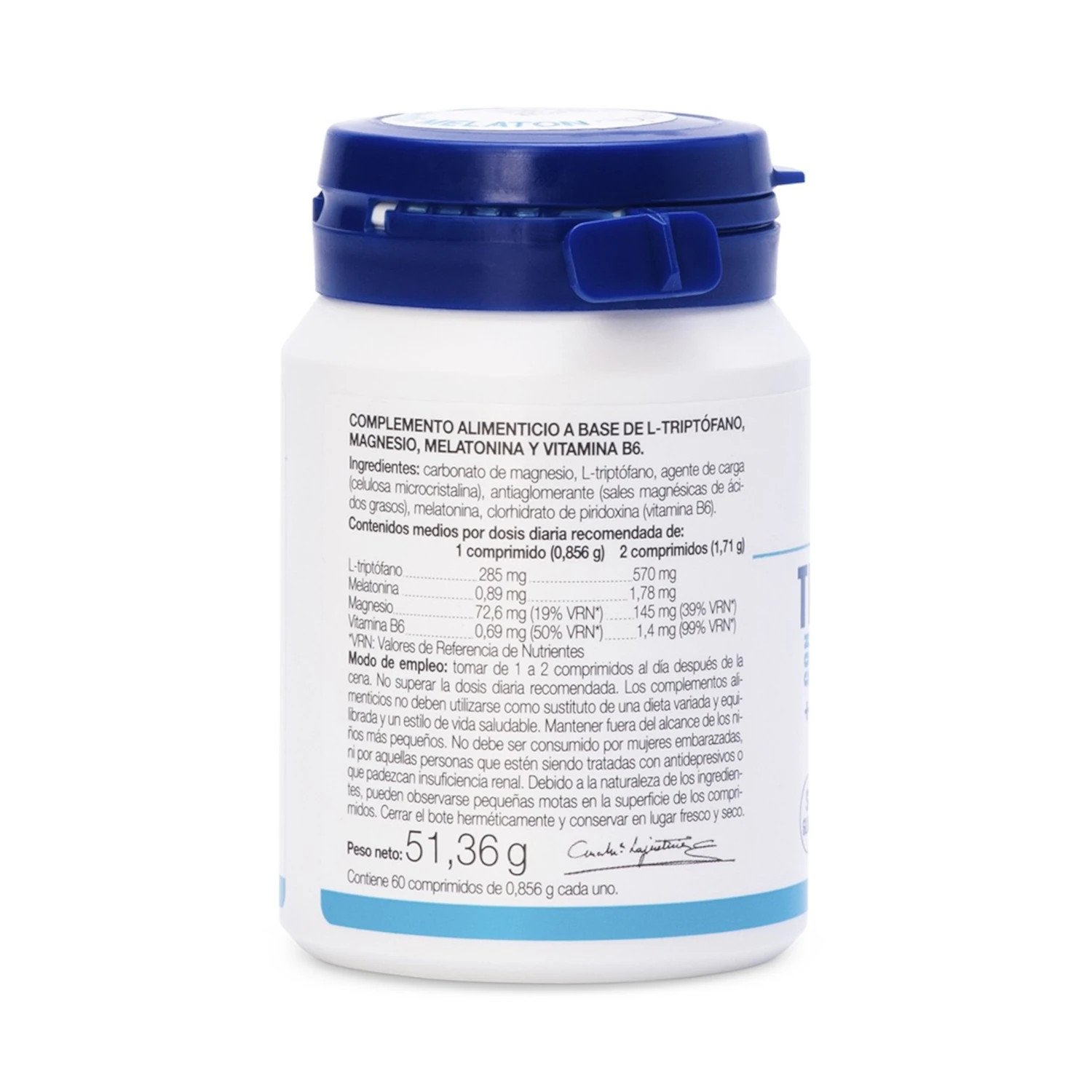 · 2 comprimidos (1,71 g): L-triptófano 570 mg, melatonina 1,78 mg, magnesio 145 mg (39% VRN*) y vitamina B6 1,4 mg (99% VRN*).
